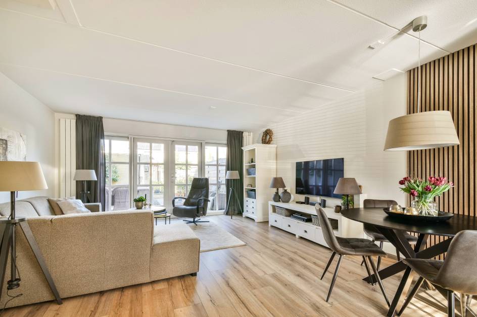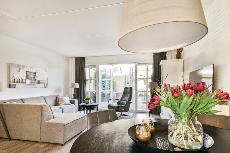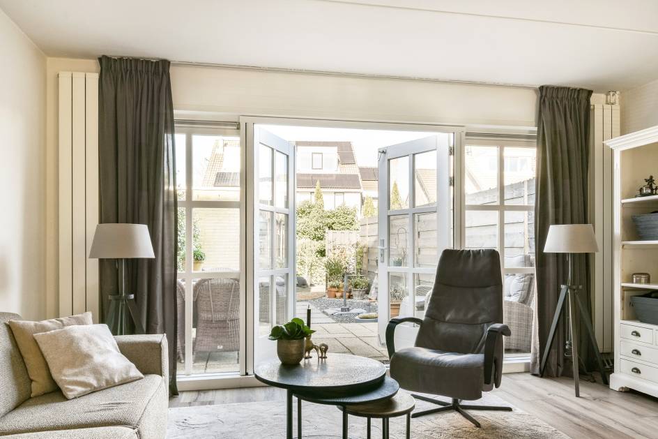 • Lichte woonkamer met openslaande deuren naar de tuin