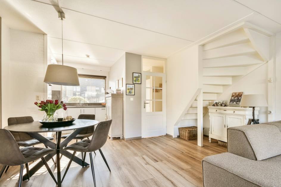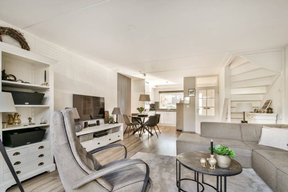 De woonkamer is ruim opgezet en staat in open verbinding met de keuken. De openslaande deuren naar de tuin zorgen voor een aangename verbinding tussen binnen en buiten en maken dit een fijne leefruimte voor zowel dagelijks gebruik als gezellige momenten.