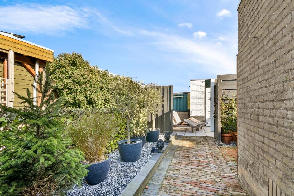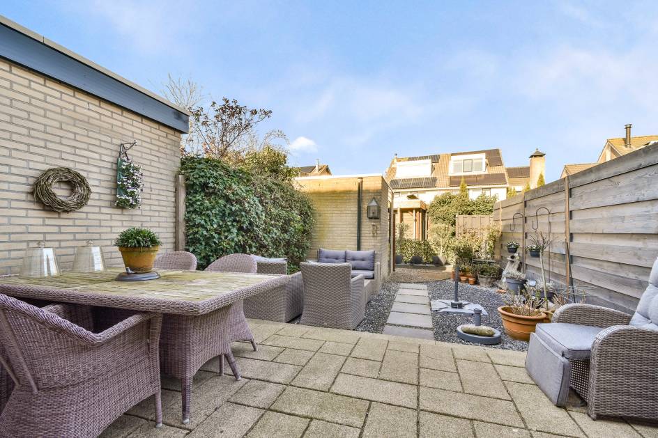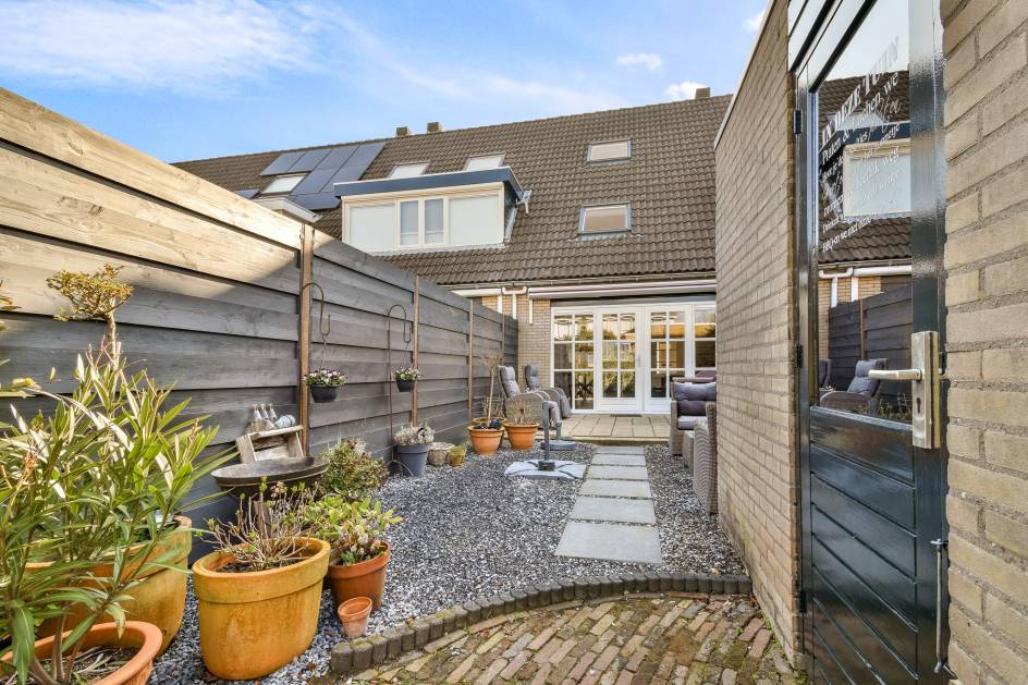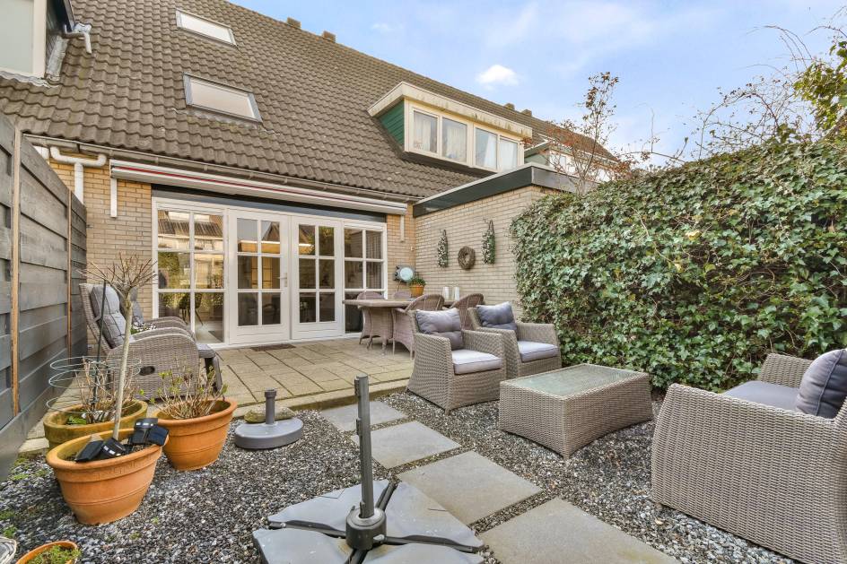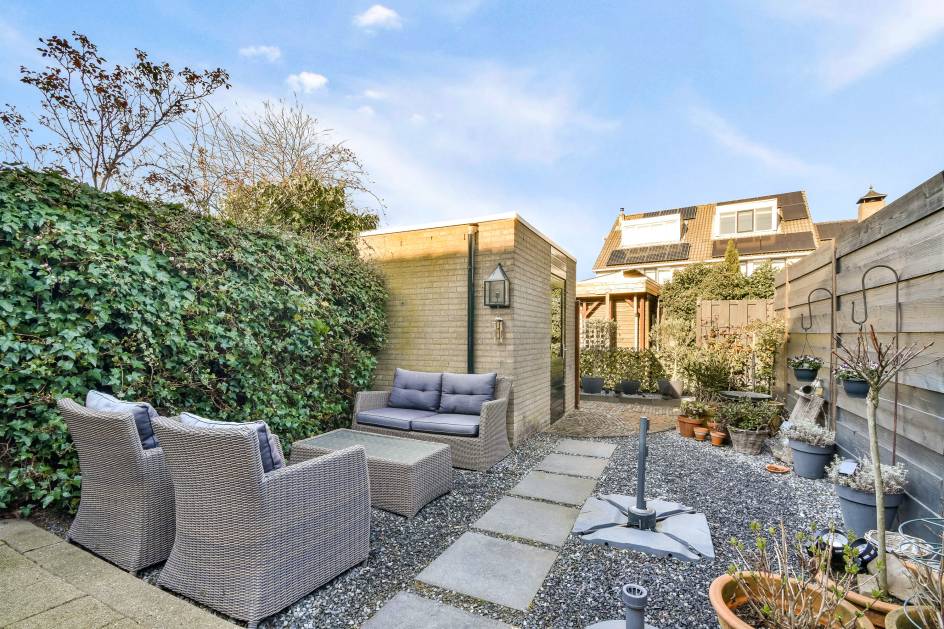 De achtertuin is gelegen op het westen en is verzorgd aangelegd met bestrating en grind. Het elektrische zonnescherm zorgt voor extra comfort op zonnige dagen. Daarnaast beschikt de tuin over een wateraansluiting, een stenen berging en een achterom via een privépoort.