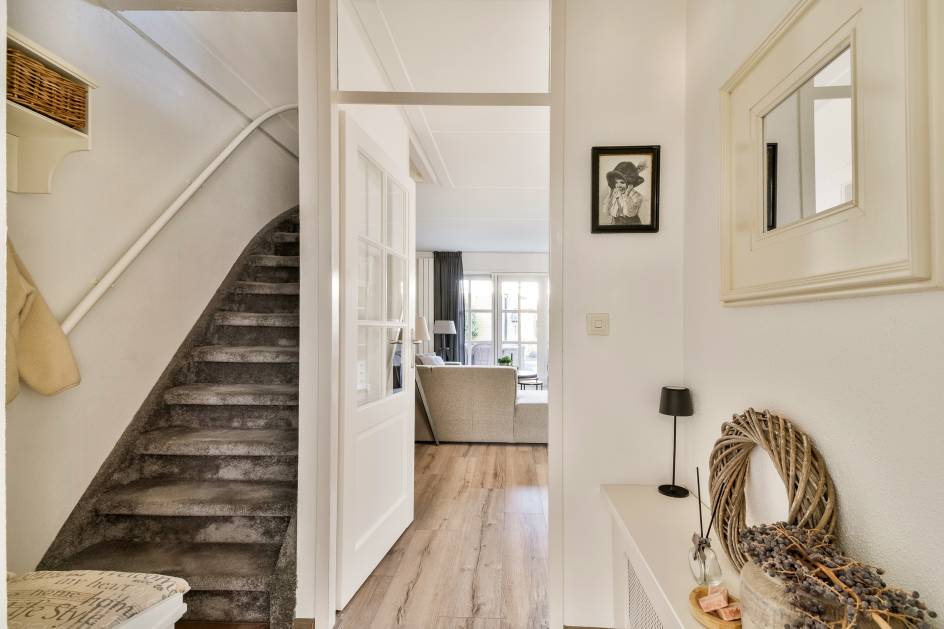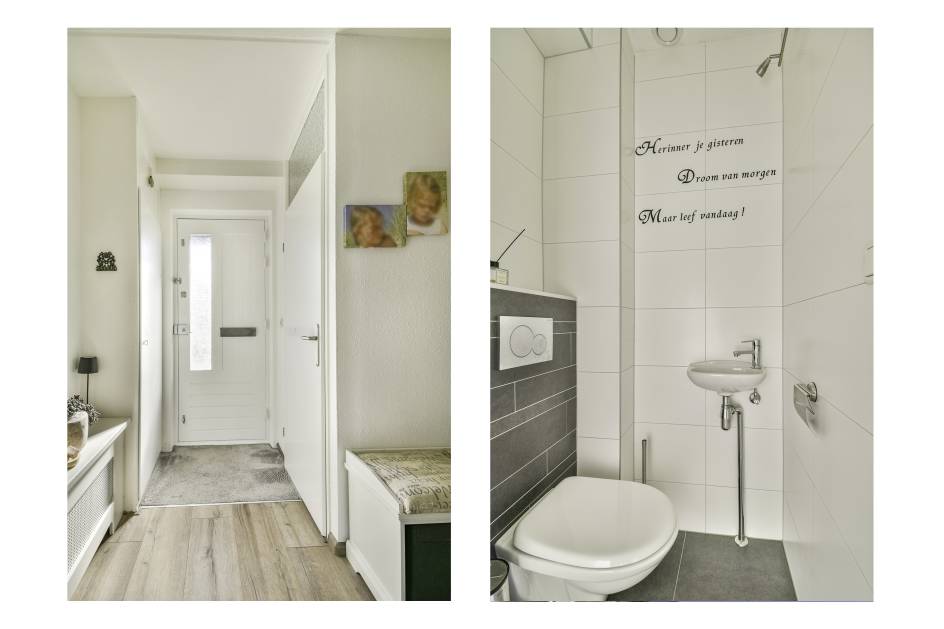 De hal geeft toegang tot de meterkast, een volledig betegeld toilet met ventilatie en de trapopgang naar de eerste verdieping.