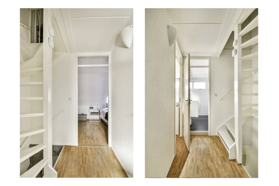 De overloop geeft toegang tot twee slaapkamers en de badkamer.