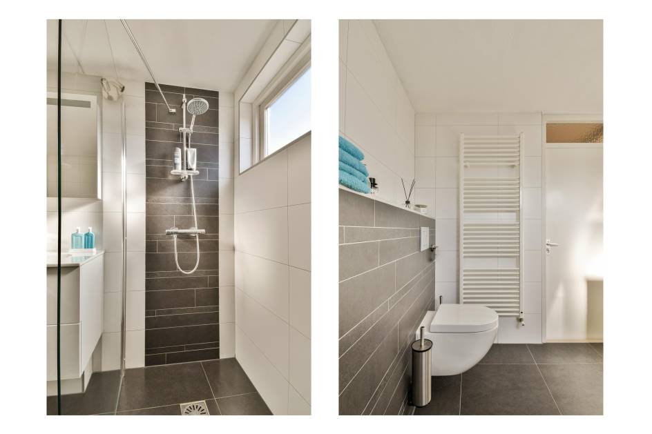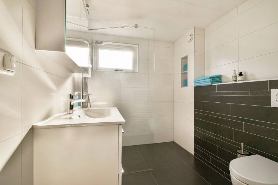 De badkamer beschikt over een inloopdouche, toilet, wastafelmeubel en een ventilatiesysteem.