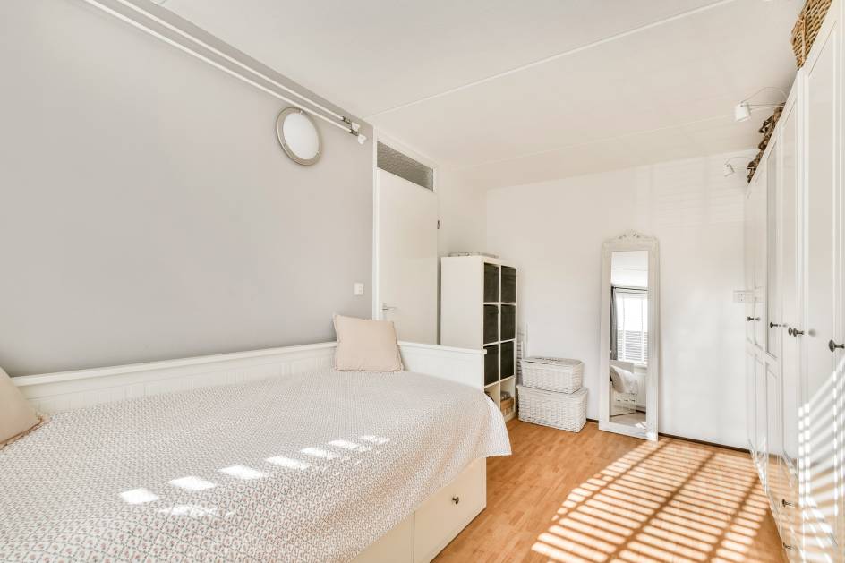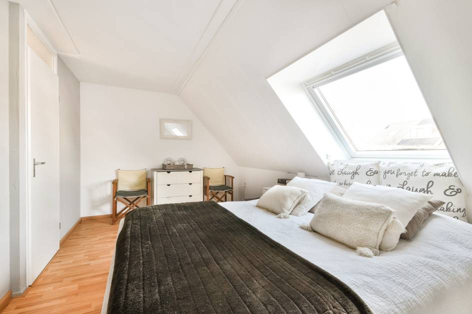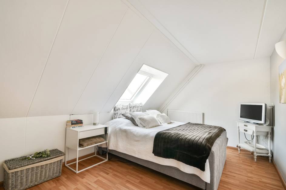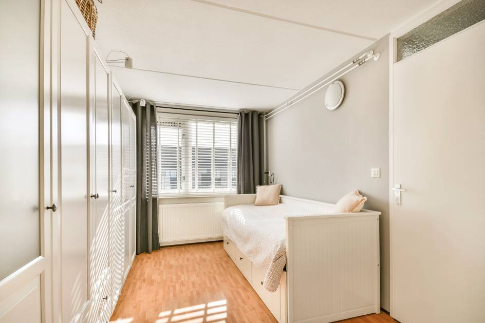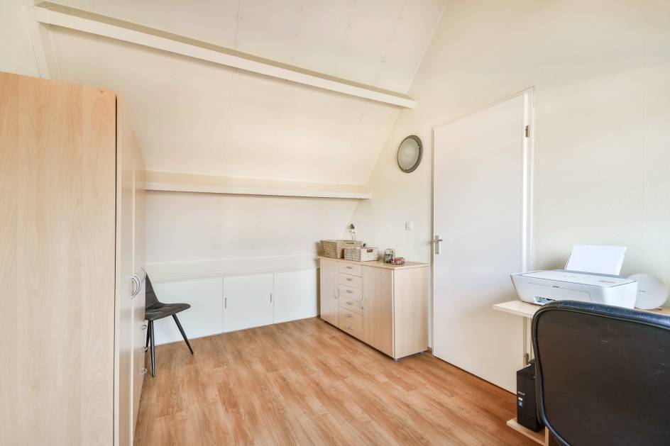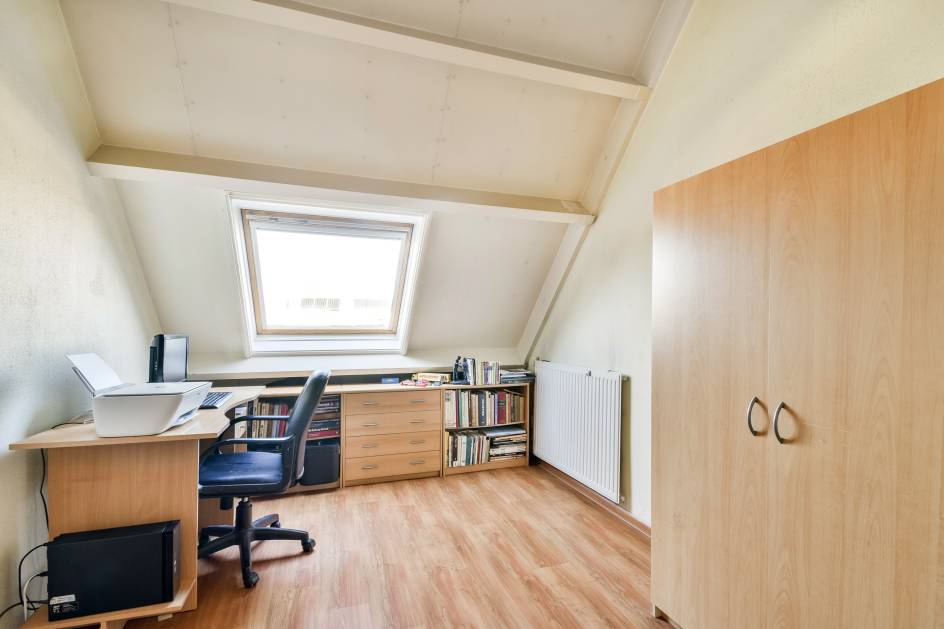 De hoofdslaapkamer is voorzien van een dakraam en heeft een prettige lichtinval. De tweede kamer is momenteel ingericht als kastenkamer, maar is ook geschikt als slaapkamer of werkkamer.