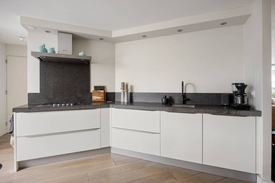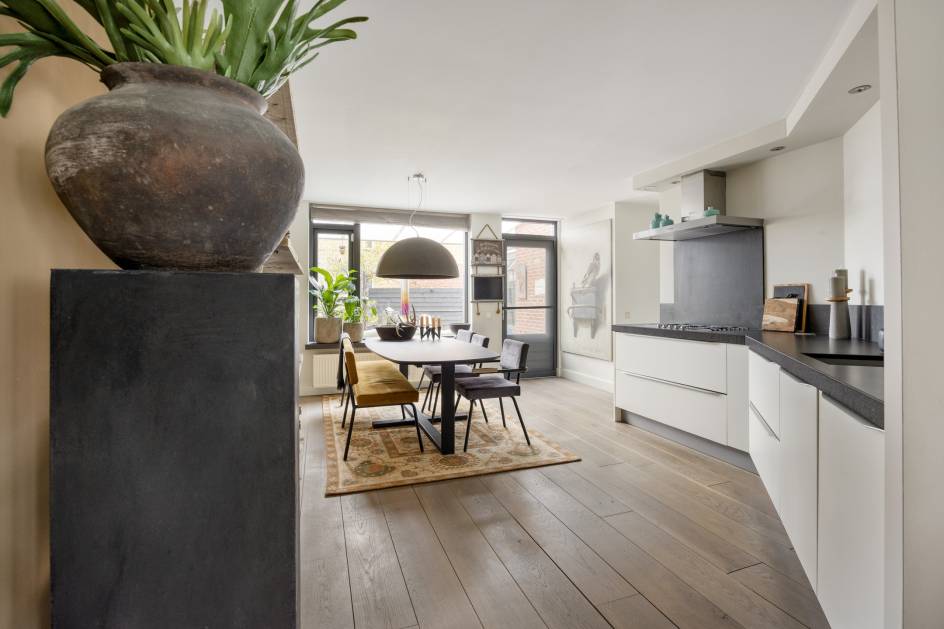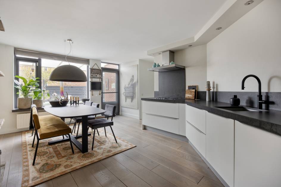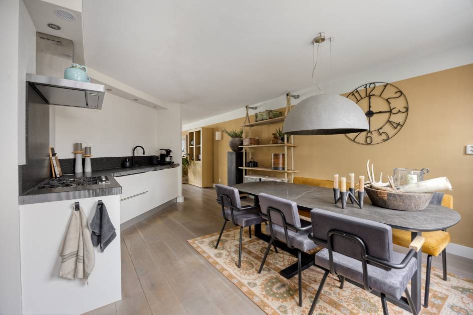 Aan de achterzijde van de woning treft u de eetkamer en keuken. De keuken is uitgevoerd in wandopstelling en voorzien van een 5- pits gaskookplaat, afzuigkap, vaatwasser, koel-vriescombinatie, combioven (2024) en grote dubbele lades voor veel opbergruimte.