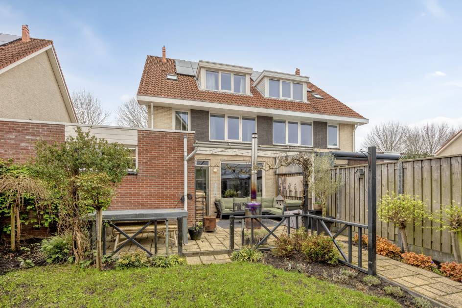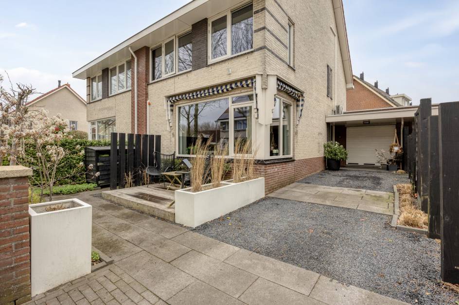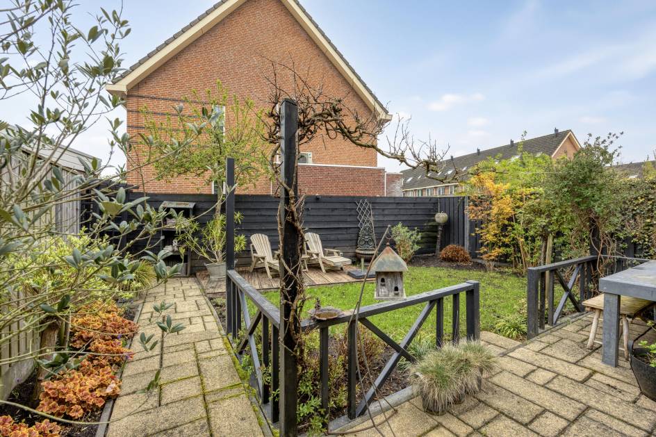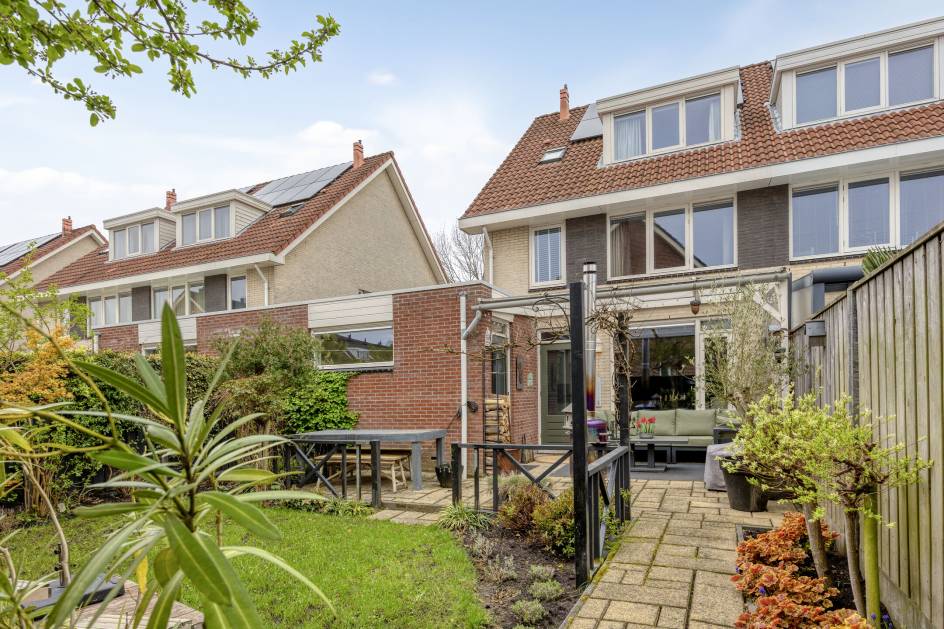 De woning is aan de voorzijde gelegen aan een autoluwe laan met parkeerruimte voor meerdere auto’s op de eigen oprit. De ruime inpandige garage heeft een elektrische garagedeur. De zonnige achtertuin op het oosten heeft een sfeervolle overkapping, diverse groenborders en een achterom. De tuin is voorzien van een schutting op betonpalen.