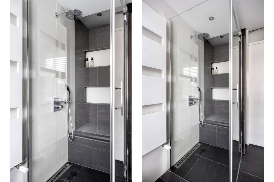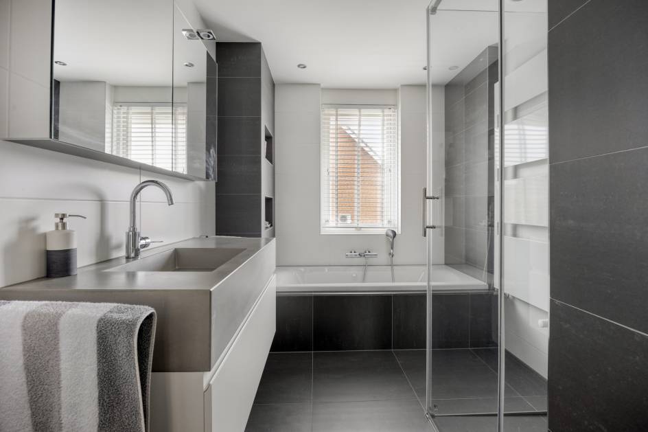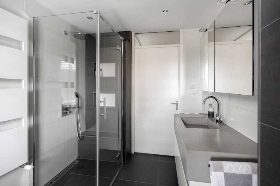 De luxe badkamer (2017) is van alle gemakken voorzien en beschikt over een ligbad, ruim wastafelmeubel, spiegel met verlichting, design radiator en ruime inloopdouche met glazenwand, shampoo-nis, bankje, hand- en stortdouche.