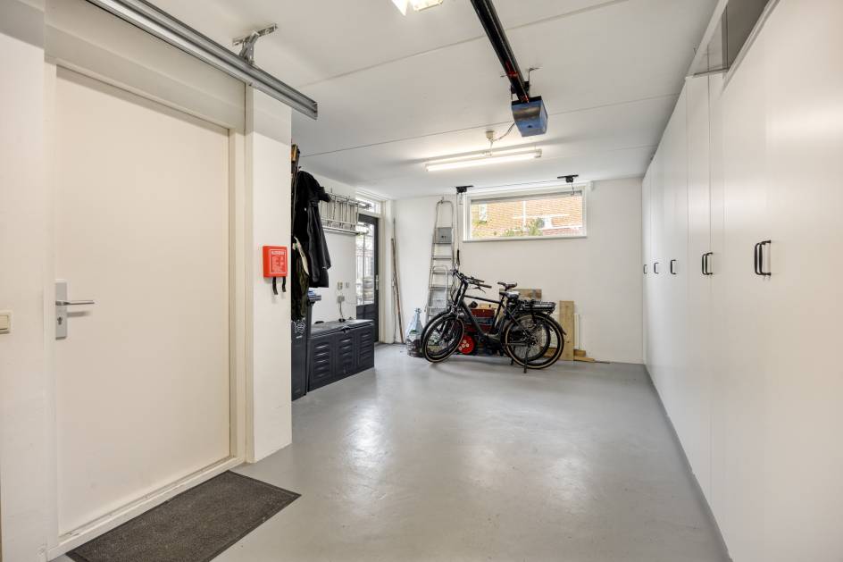 De garage is voorzien van een kastenwand (ter overname), elektrische garagedeur, wateraansluiting en een loopdeur naar de achtertuin.