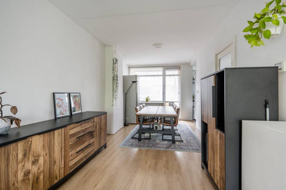 De lichte woonkamer biedt genoeg ruimte voor een riante zit- en eethoek. De keuken beschikt over een 4-pits gasfornuis, koelkast, afzuigkap, oven, magnetron en vaatwasser. Verder geeft de keuken toegang tot het balkon.