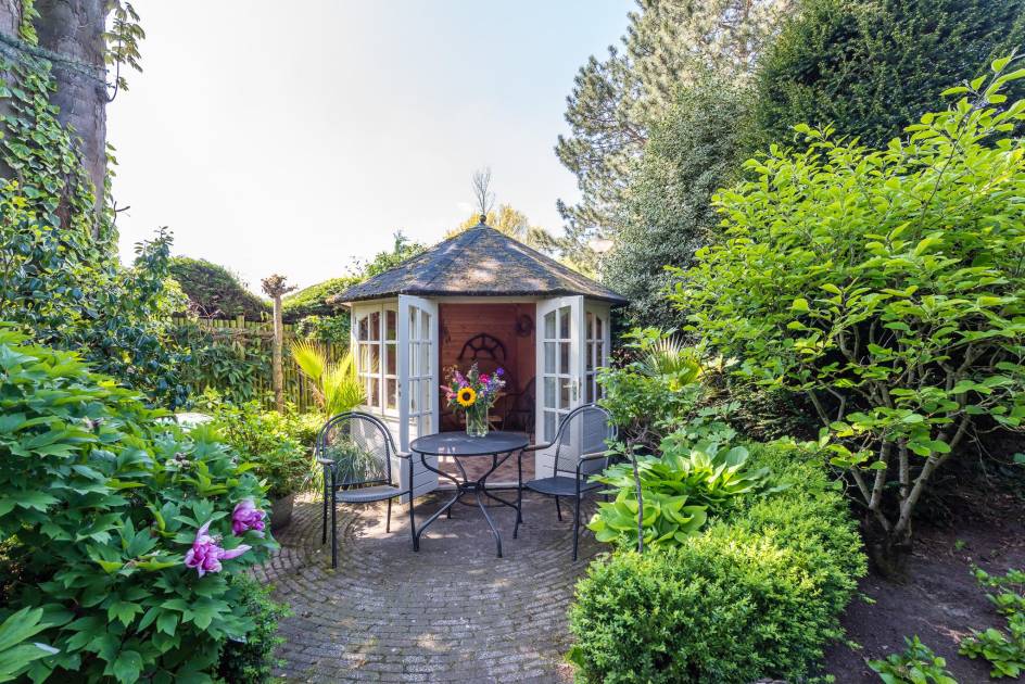 Op het besloten terras achter het huis gelegen op het zuiden geniet u heerlijk van de zon. Verder is er een zonnescherm aanwezig en achter in de tuin een sfeervol houten tuinhuis.