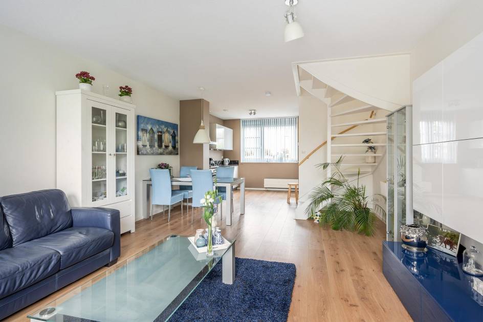 De woonkamer aan de tuinzijde heeft veel lichtinval door de grote ramen en openslaande deuren naar de tuin. De woonkamer biedt voldoende ruimte voor een riante zithoek en heeft een open trap naar de 1e verdieping.