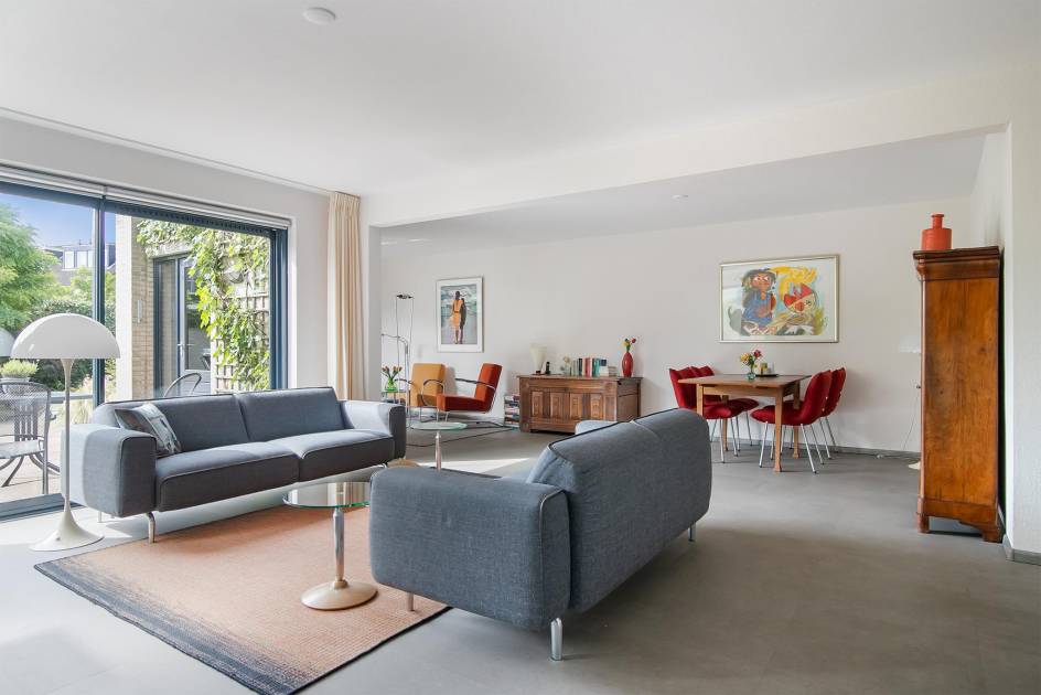 De woonkamer kenmerkt zich door verschillende gedeelten die nu in zijn geheel in gebruik zijn. De tuin die recent is aangelegd, speelt vanuit alle gedeelte van de woonkamer een prominente plaats. Anders gezegd: de tuin is eenvoudig vanuit de woonkamer te bereiken.