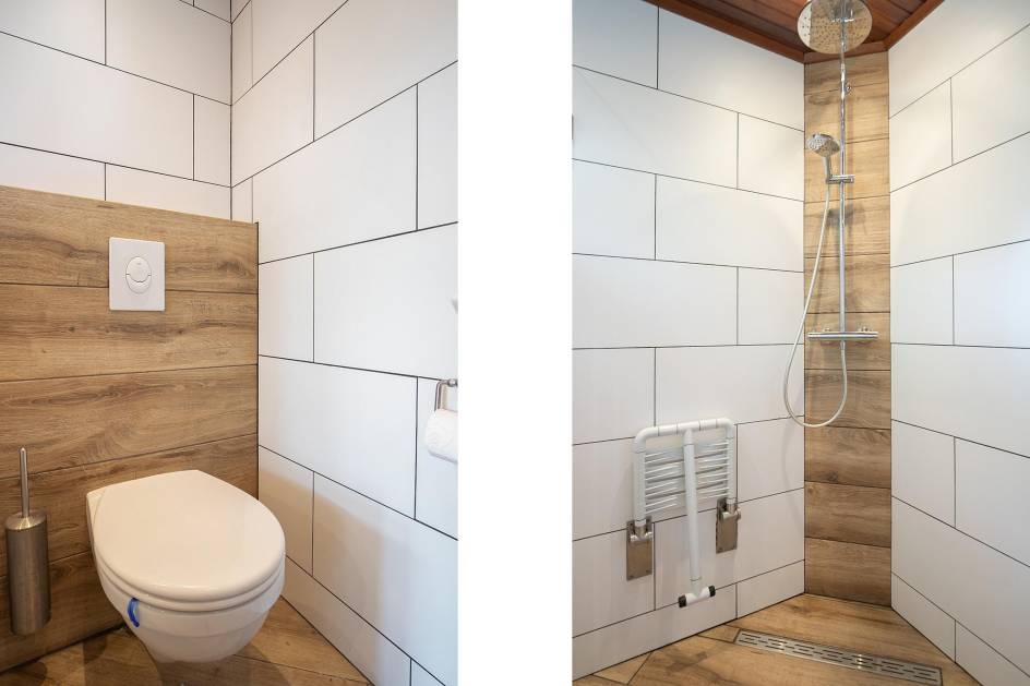 De moderne badkamer is volledig betegeld en voorzien van een inloopdouche met glazenwand, ligbad met televisie, wastafelmeubel en 2e toilet.