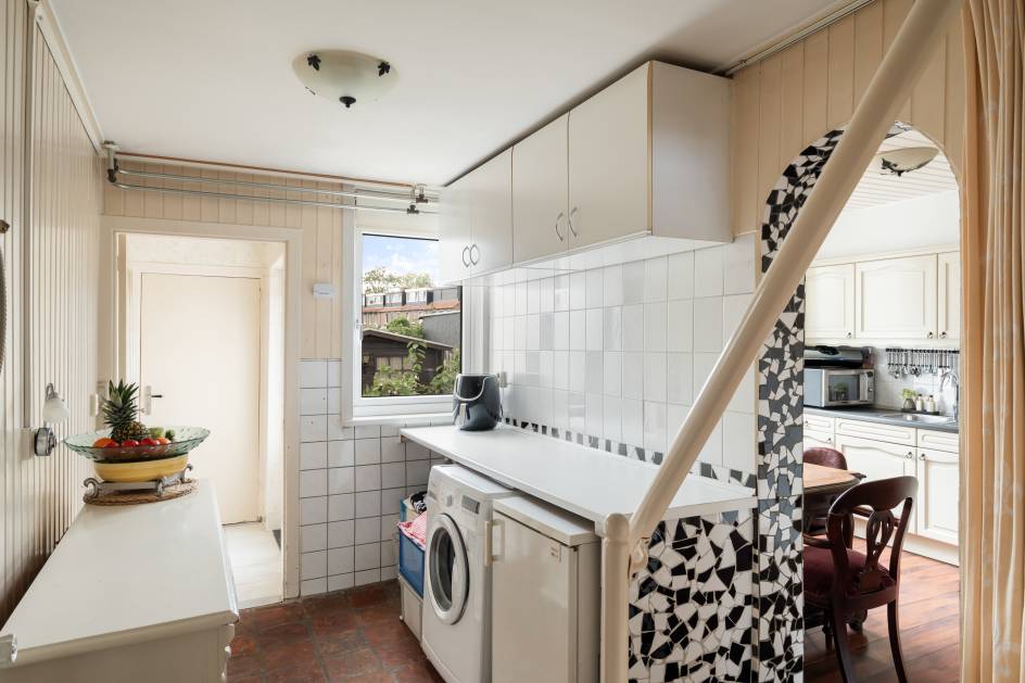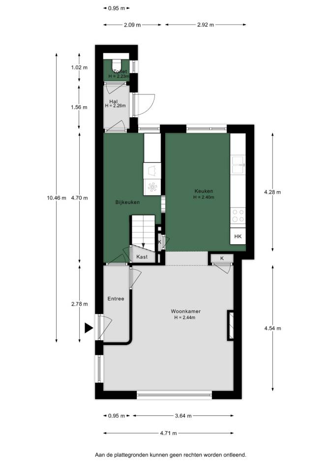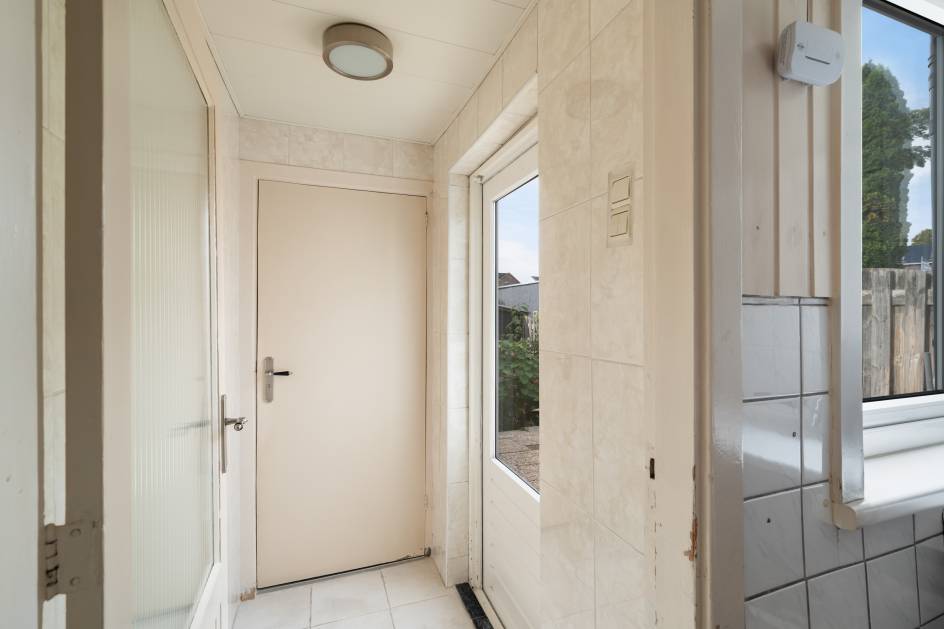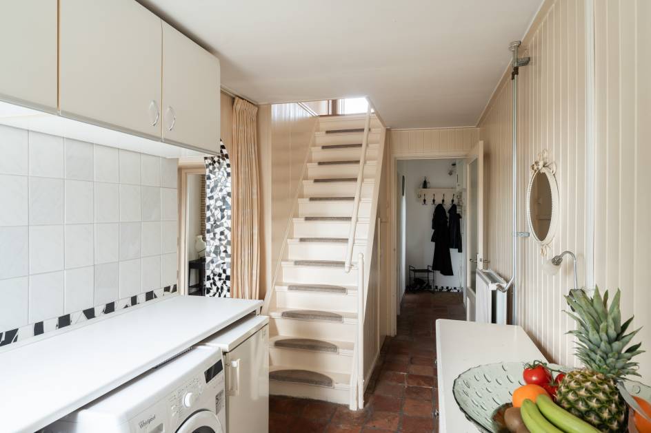 Begane grond: Entree met hal, trapkast en toegang tot de bijkeuken. Het toilet is volledig betegeld. De keuken is voorzien van een 4-pits gasfornuis, inbouwafzuigkap, koelkast, vriezer en bergkast. De woonkamer is licht en beschikt eveneens over een aantal praktische bergkasten.