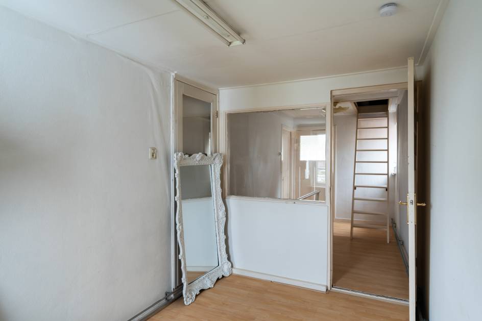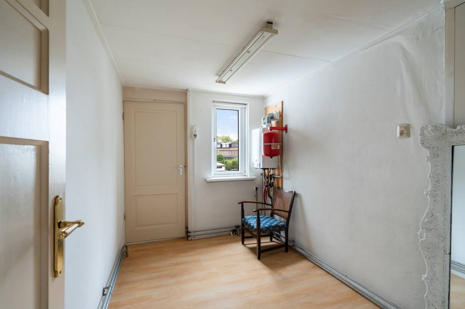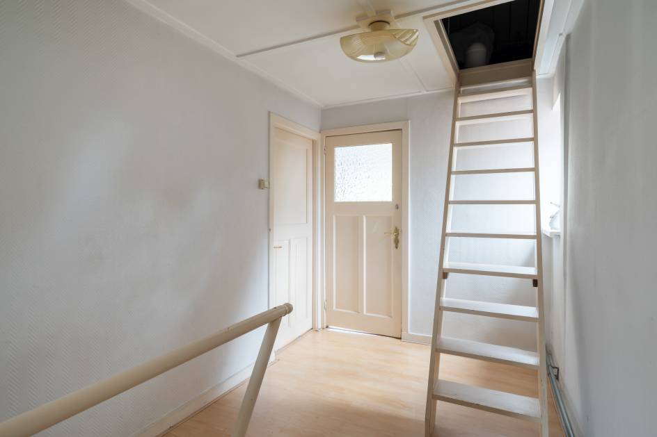 Via een vaste trap is de grote vliering bereikbaar, die veel extra bergruimte biedt.