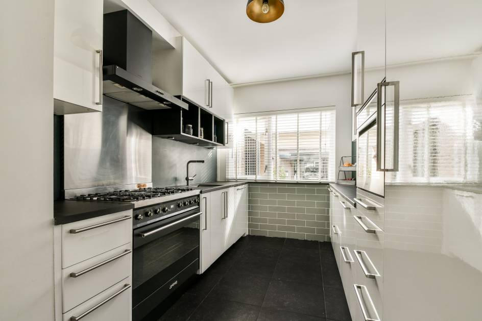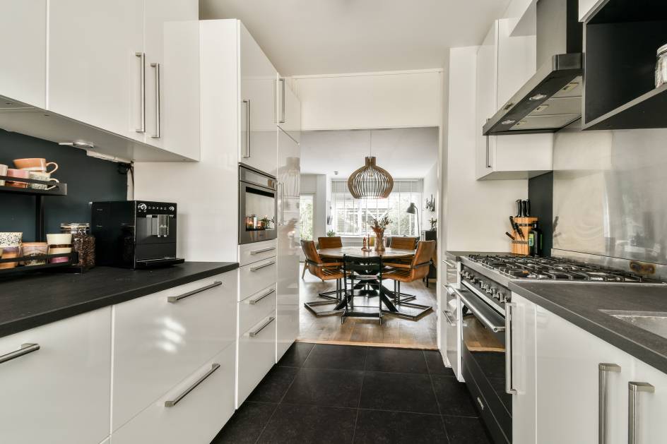 Aan de voorzijde van de woning bevindt zich de moderne open keuken.