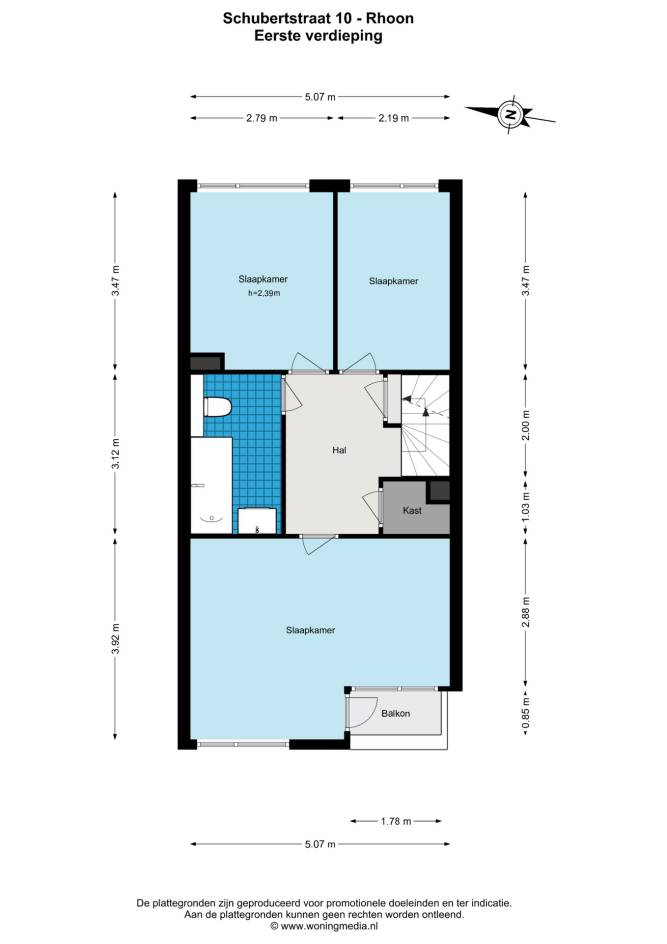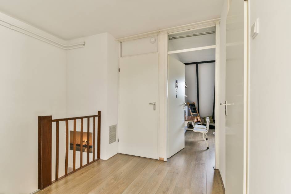 1e verdieping: Overloop, 3 slaapkamers en badkamer. Aan de achterzijde van de woning bevindt zich de grote slaapkamer met toegang tot het balkon. De andere 2 slaapkamers bevinden zich aan de voorzijde van de woning.
