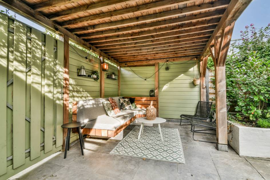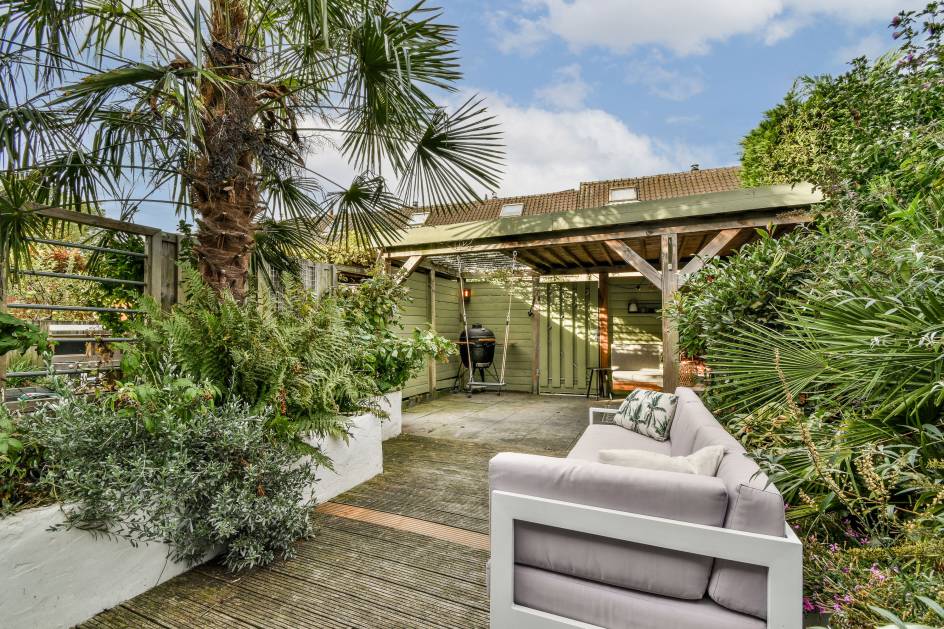 - Ruime achtertuin met overkapping op het westen;