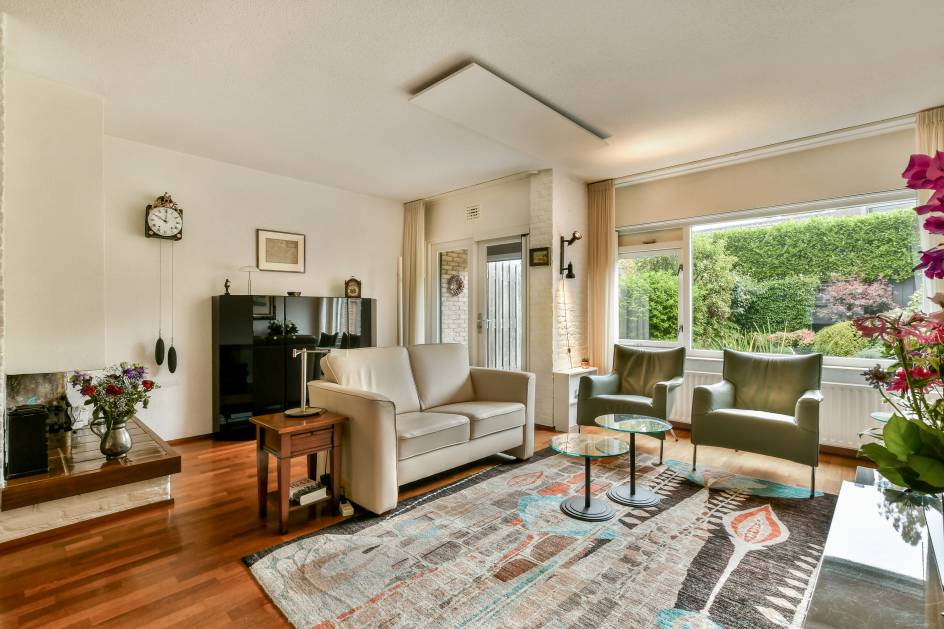 - Sfeervolle woonkamer met open haard en openslaande deuren;