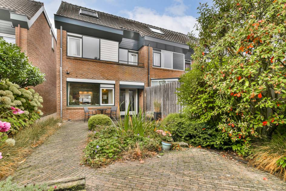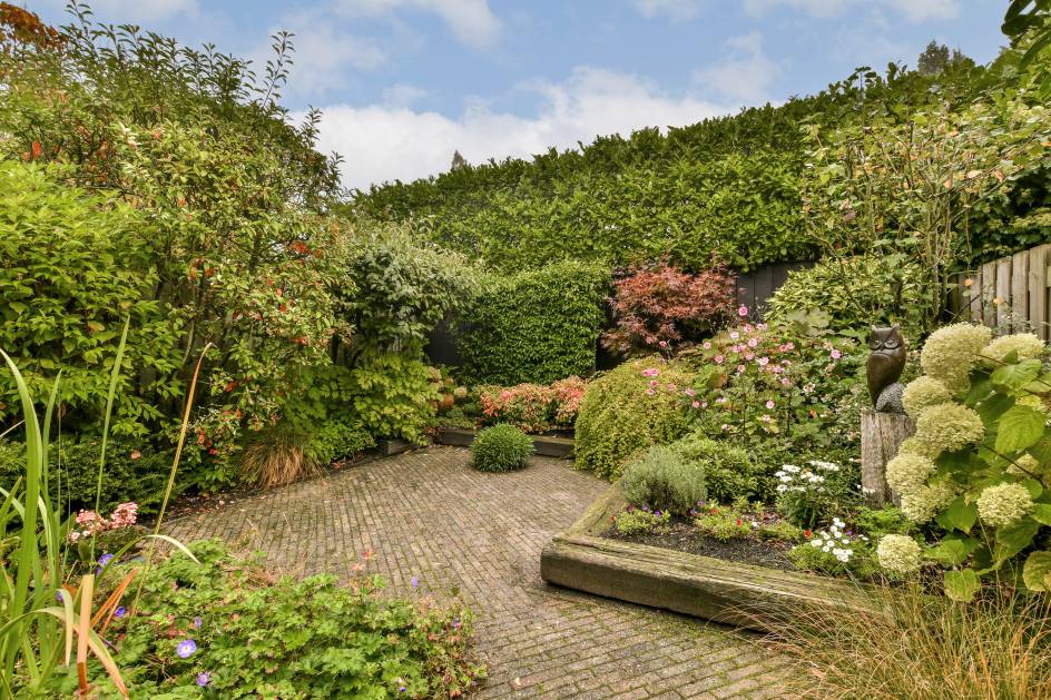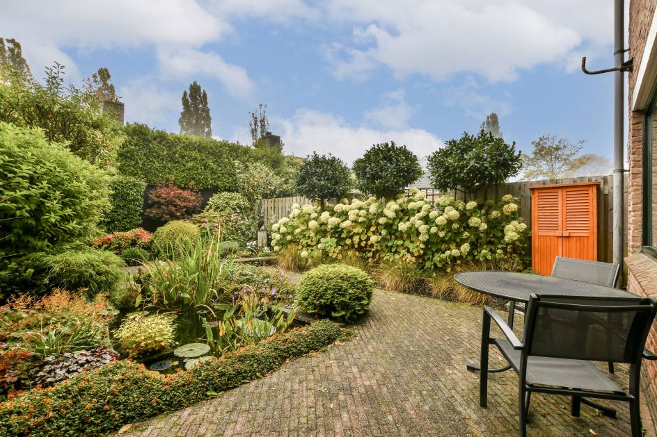 De achtertuin ligt op het oosten en is sfeervol aangelegd met groene borders, een mooie vijver en een terras waar u kunt genieten van de ochtend- en middagzon. Aan de zijkant van de woning bevindt zich een eigen zijpad naar de tuin, wat extra praktisch is. In de voortuin staat een stenen berging.