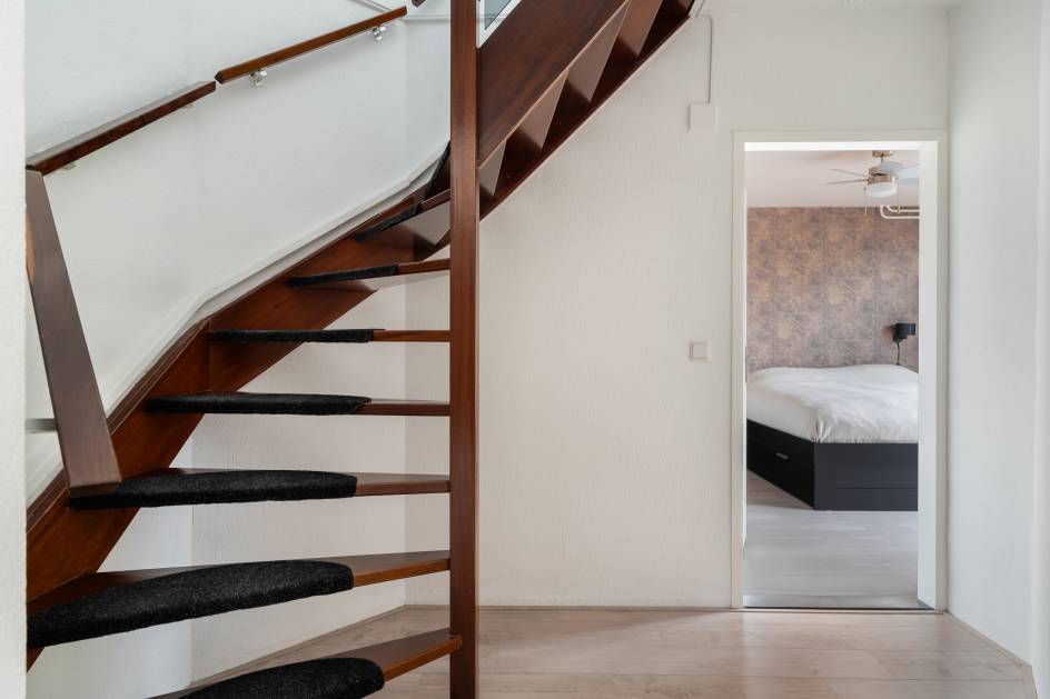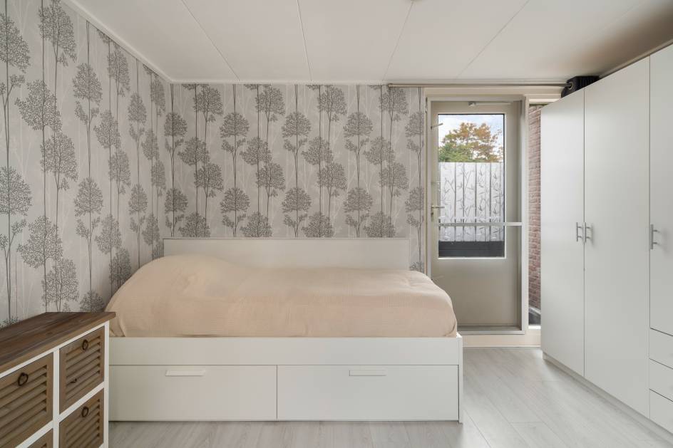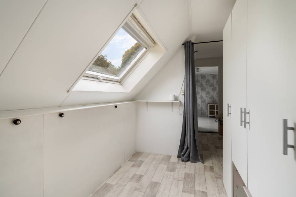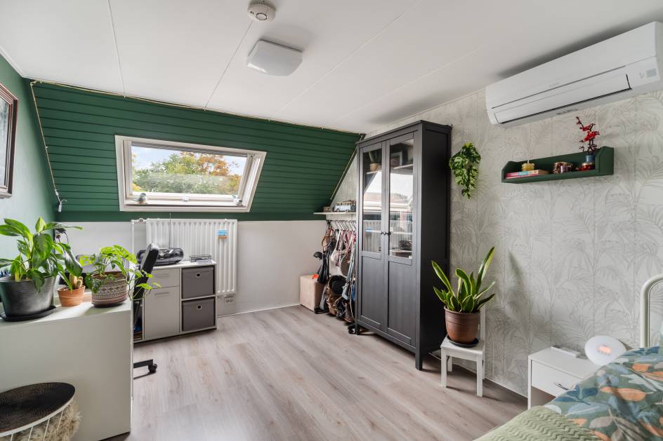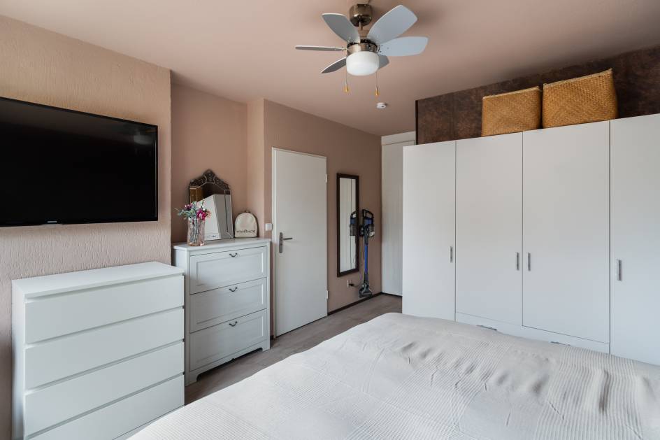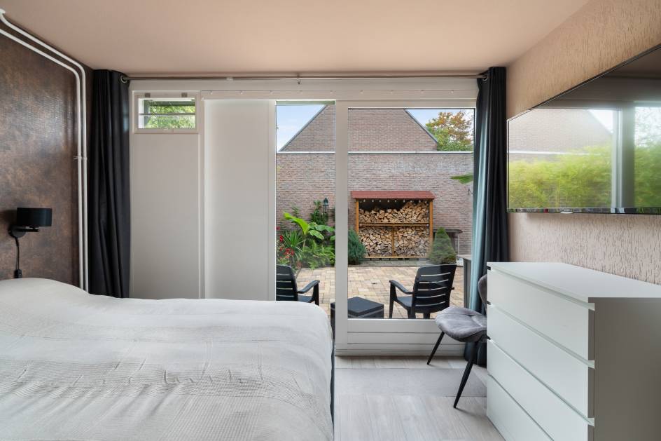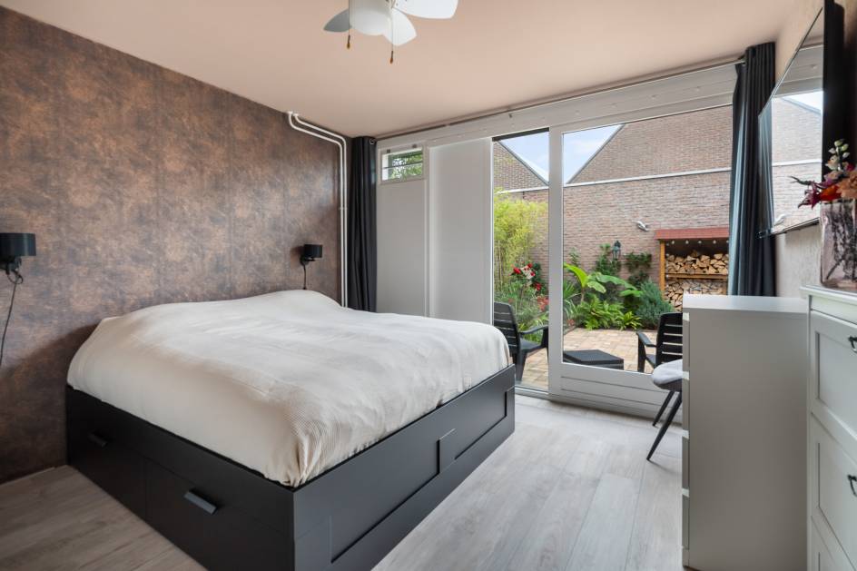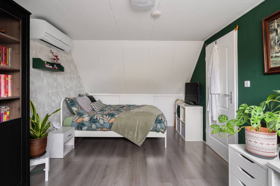 Via de tussenruimte betreedt u de grote slaapkamer die is voorzien van een airco (geplaatst in 2024) en overal is dubbel glas aanwezig.
