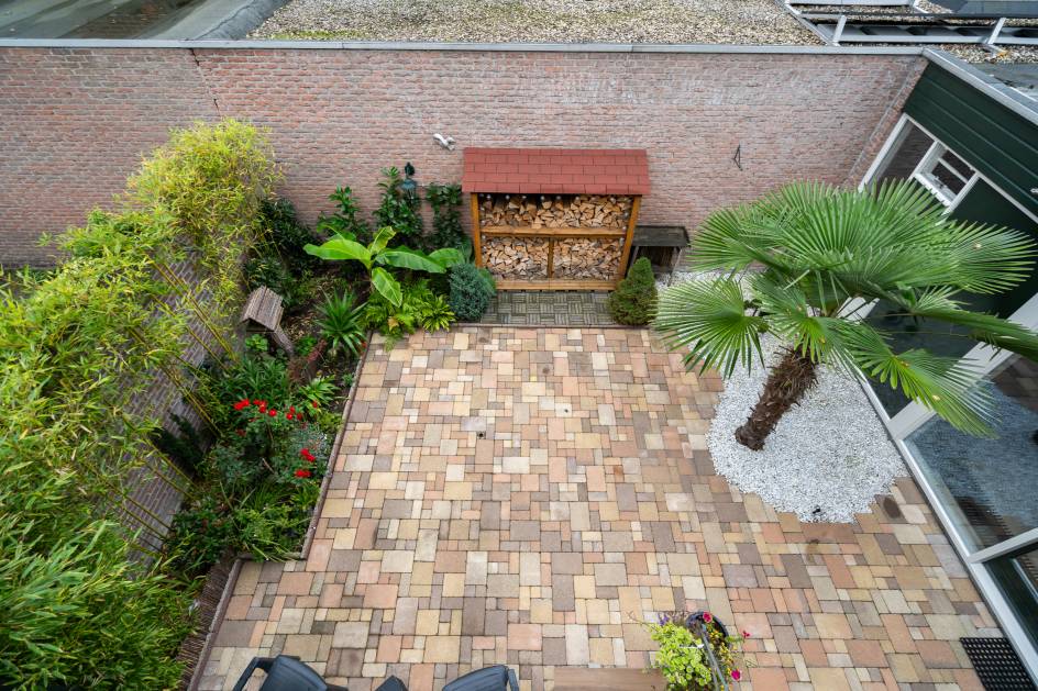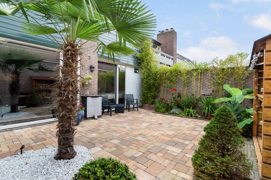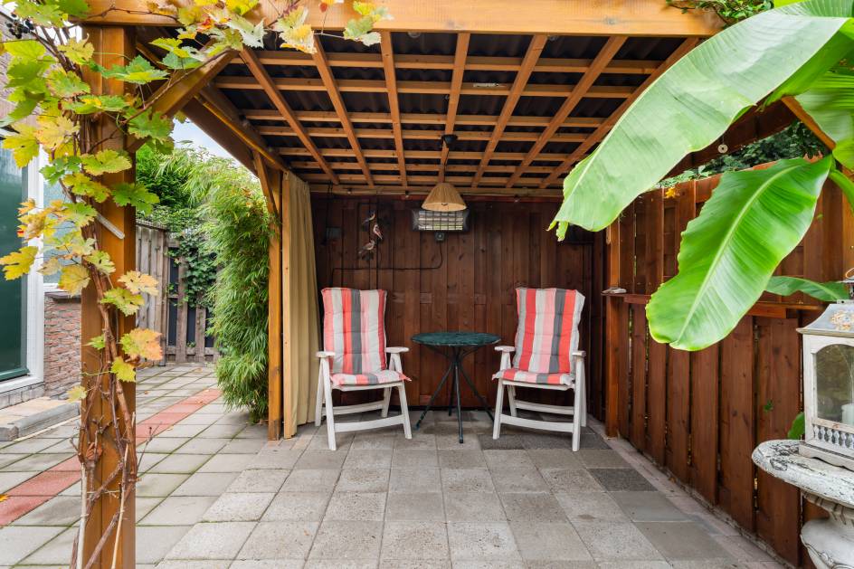 De onderhoudsvriendelijke patio op het zuiden is sfeervol ingericht en bereikbaar via huiskamer en slaapkamer.