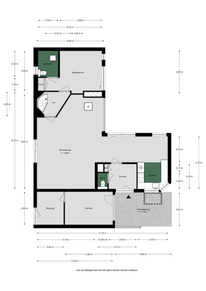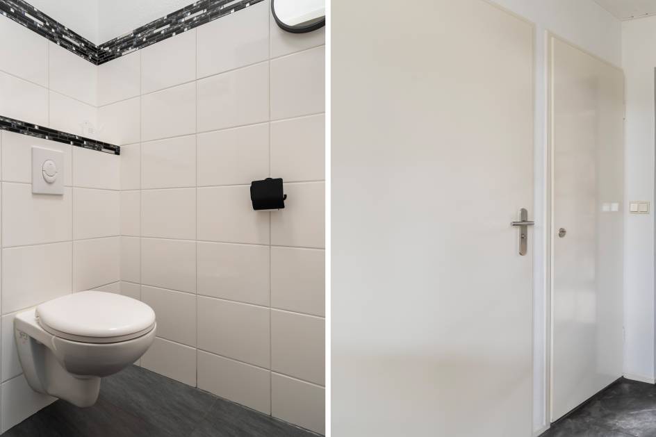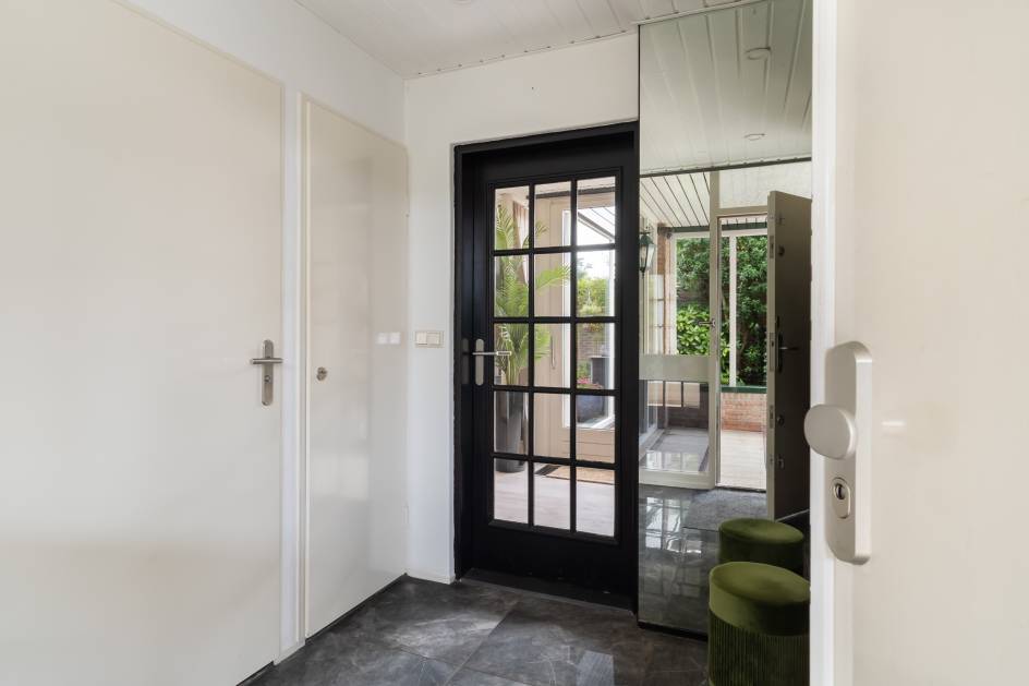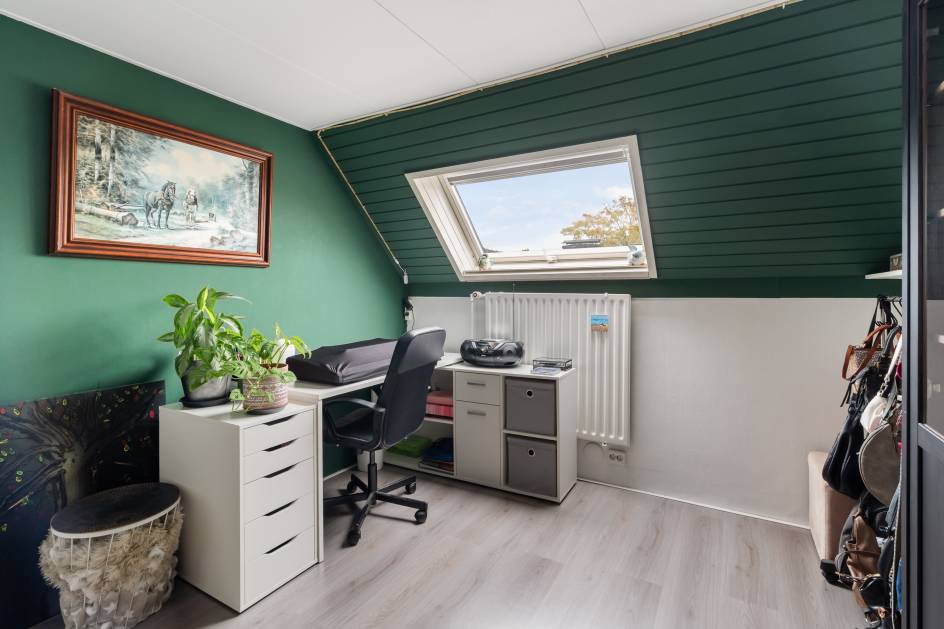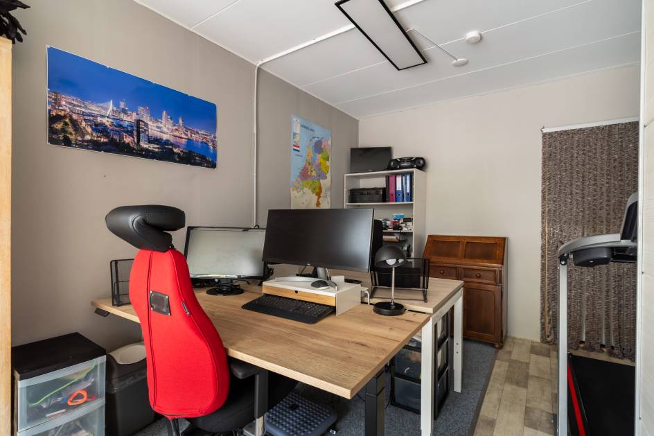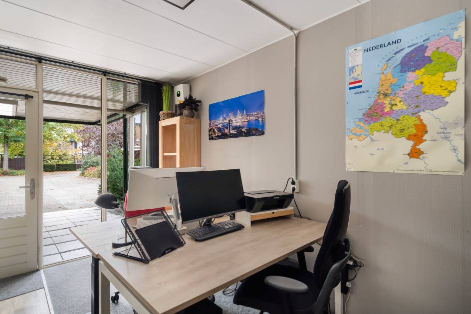 Via de carport betreedt u de ruime hal met tegelvloer, meterkast en toilet. Via de carport is er ook een aparte toegang tot de kantoorruimte aan de zijkant van de woning ideaal voor thuiswerken of als hobbykamer. Via de kantoorruimte kunt u de aangebouwde stenen berging betreden.