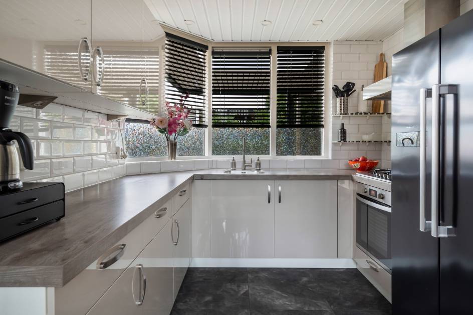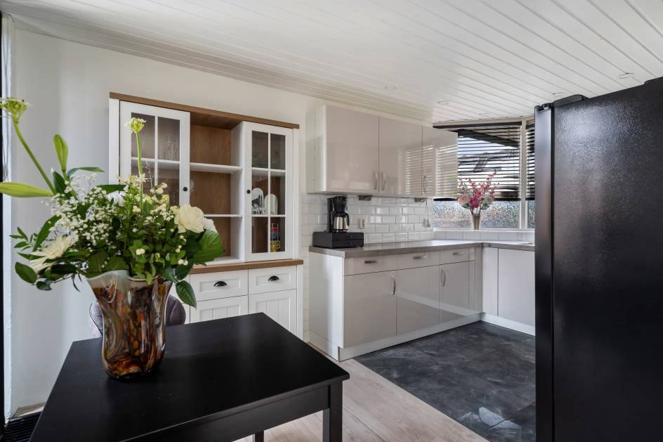 De open keuken aan de voorzijde van de woning is compleet uitgerust met een 5-pits gasfornuis, oven, afzuigkap, vaatwasser, keukenboiler en een losstaande koel-/vriescombinatie.