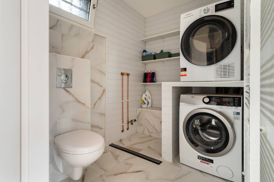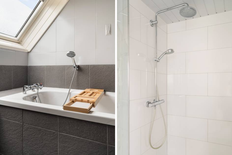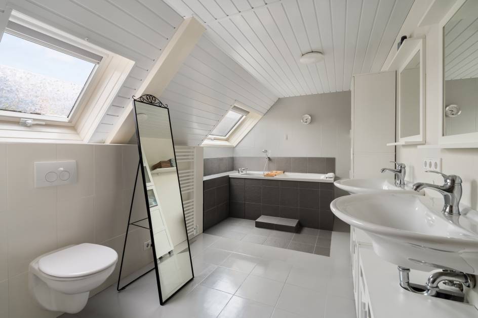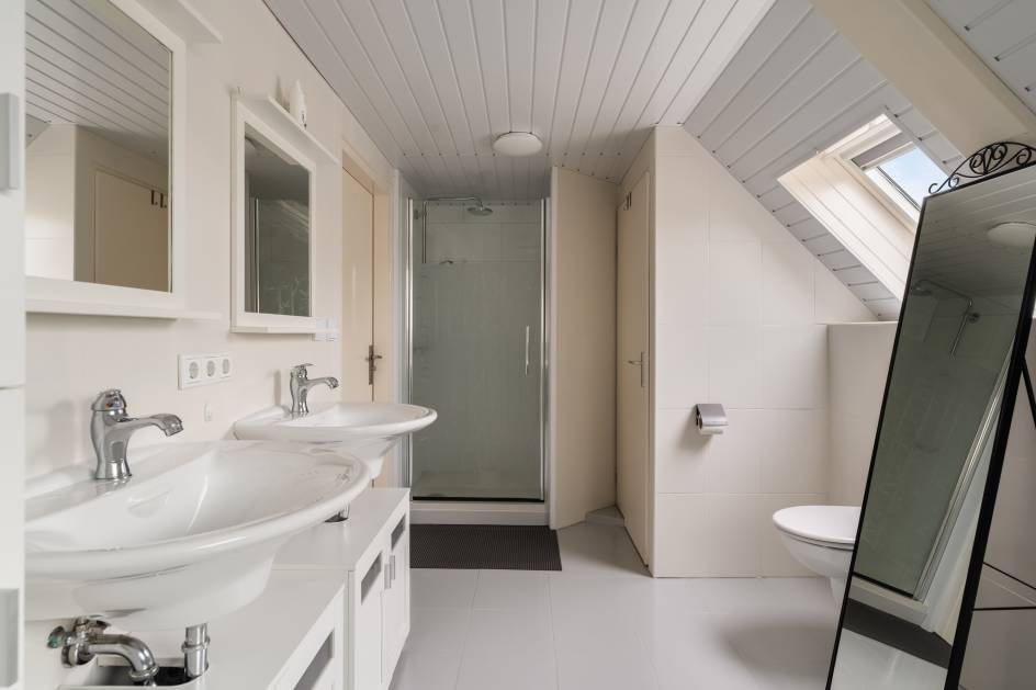 De royale badkamer is in 2024 gedeeltelijk vernieuwd en voorzien van een ligbad, douchecabine en een onderhoudsvriendelijk kunststof plafond. Dankzij de goede ventilatie en een vernieuwd kantelraam is dit een frisse en
