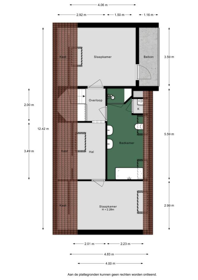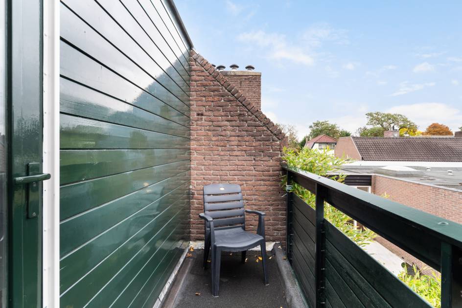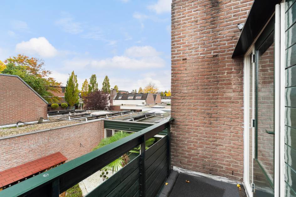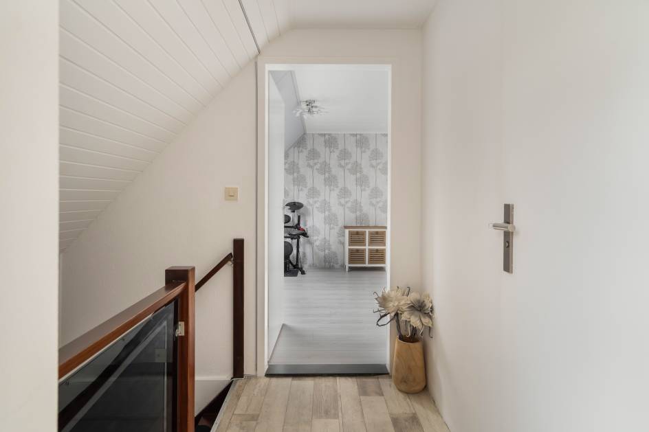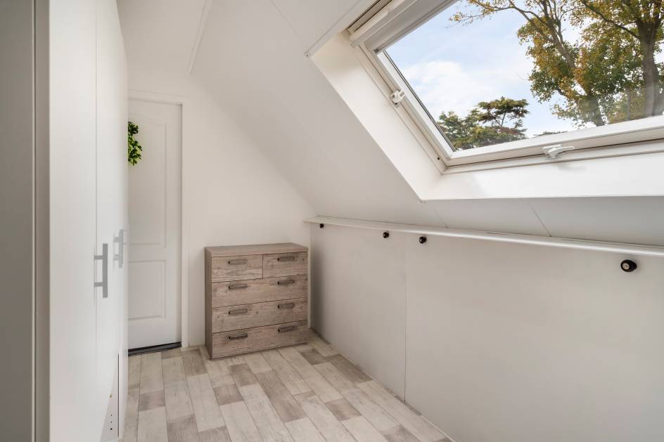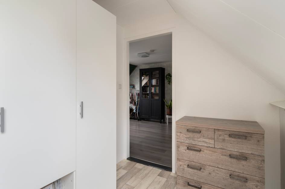 De overloop biedt toegang tot meerdere slaapkamers en de ruime badkamer. De slaapkamer aan de voorzijde (zuiden) heeft een deur naar het balkon, voorzien van een hor en is uitgerust met handige bergruimte achter de schotten. Ook de tussenruimte beschikt over extra opbergruimte.