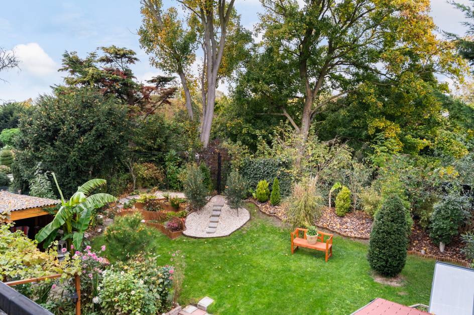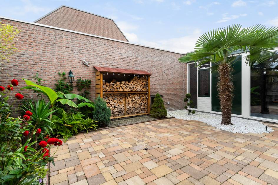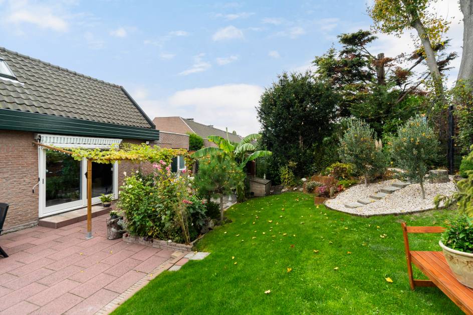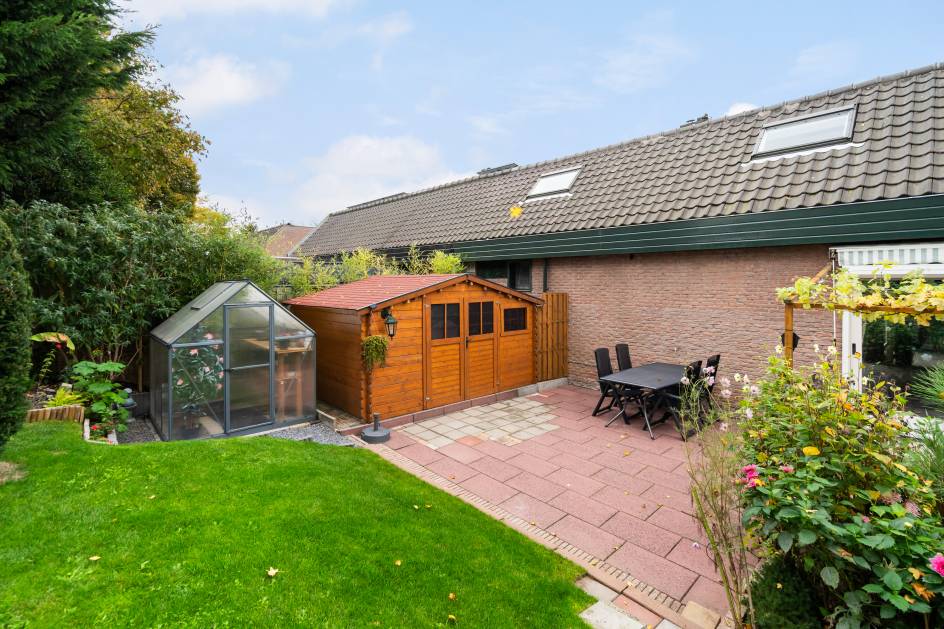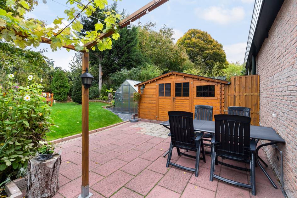 • Onderhoudsvriendelijke patio op het zuiden en grote achtertuin met overkapping, meerdere bergingen en een kas;