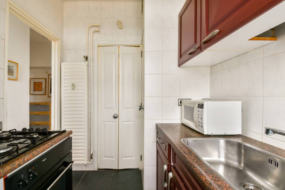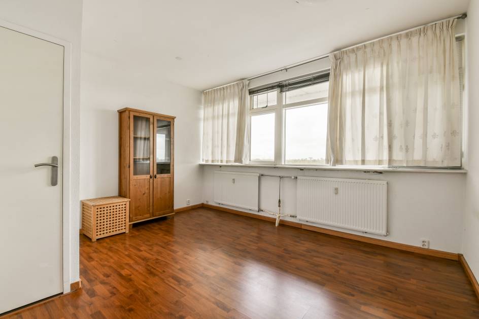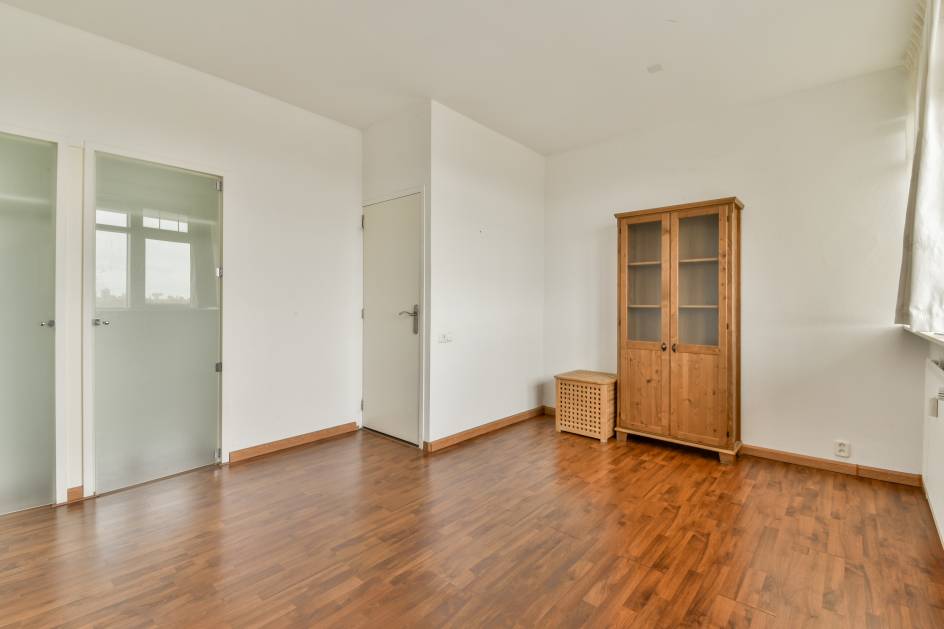 Slaapkamer: Aan de voorzijde bevindt zich een royale slaapkamer, voorzien van handige inbouwkasten. Oorspronkelijk betrof het appartement een vierkamerwoning, waarbij de indeling is aangepast en enkele kamers zijn samengevoegd tot een ruimere woonkamer en slaapkamer.