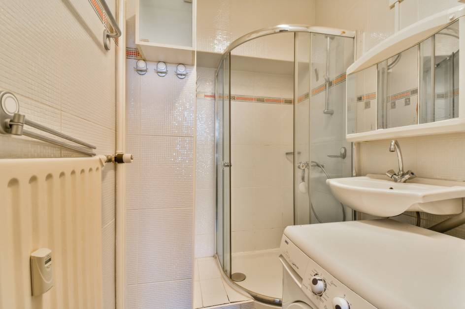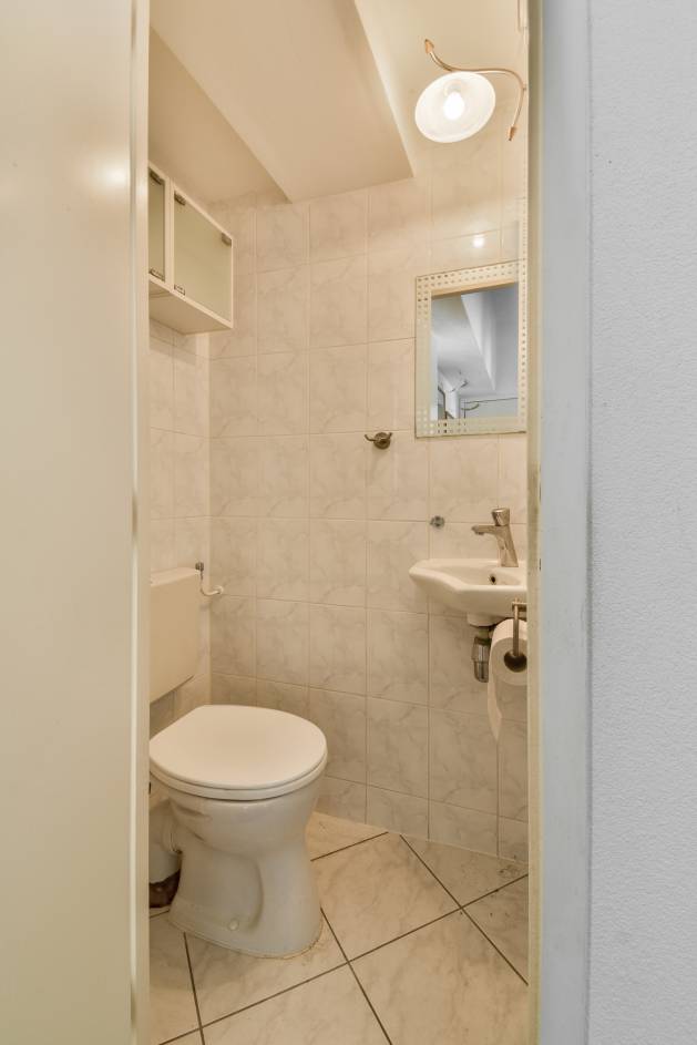 Badkamer en toilet: De badkamer beschikt over een douchecabine, wastafel en aansluiting voor de wasmachine. Daarnaast is er een separaat, betegeld toilet aanwezig.