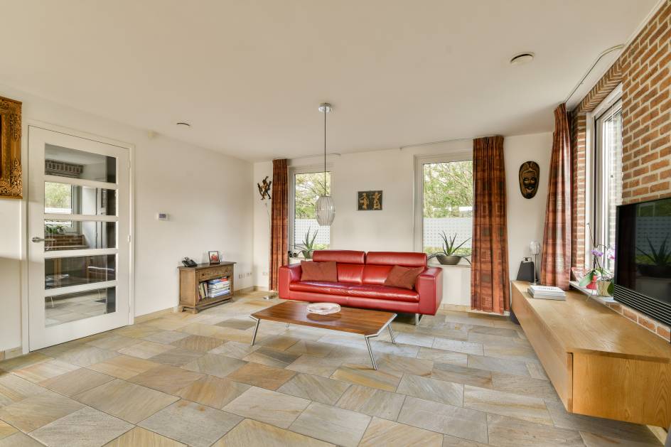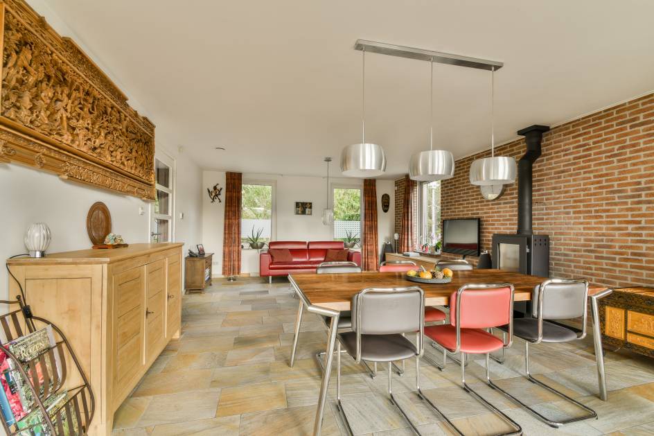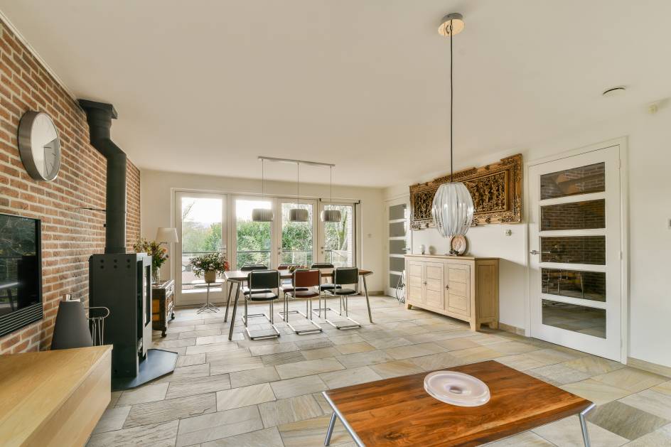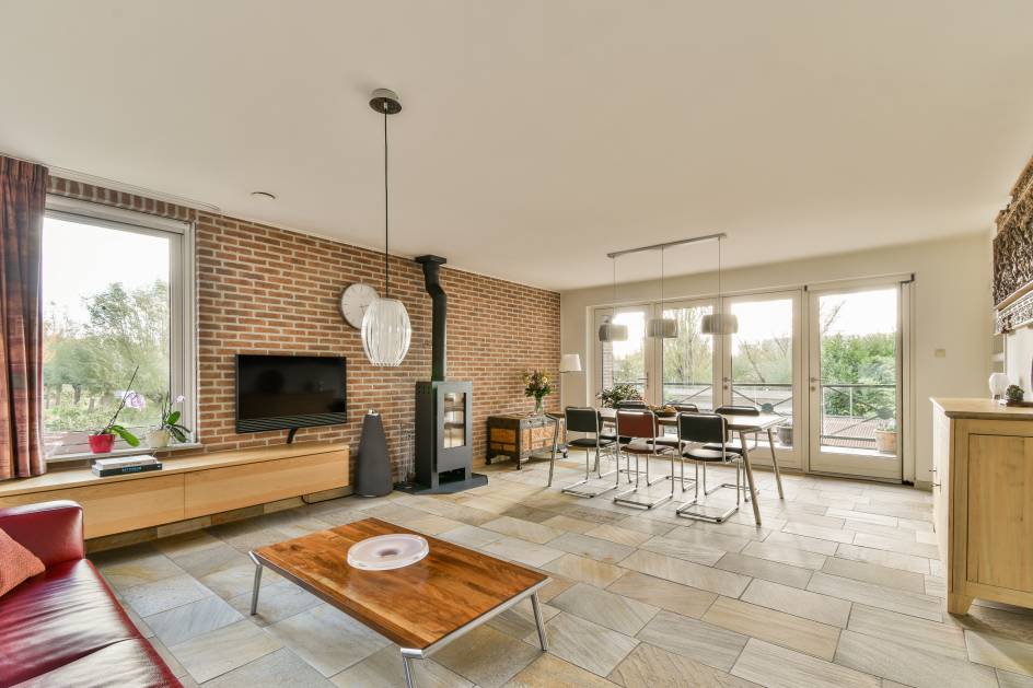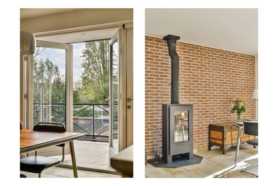 -Woonkamer met houtkachel en openslaande deuren naar terras