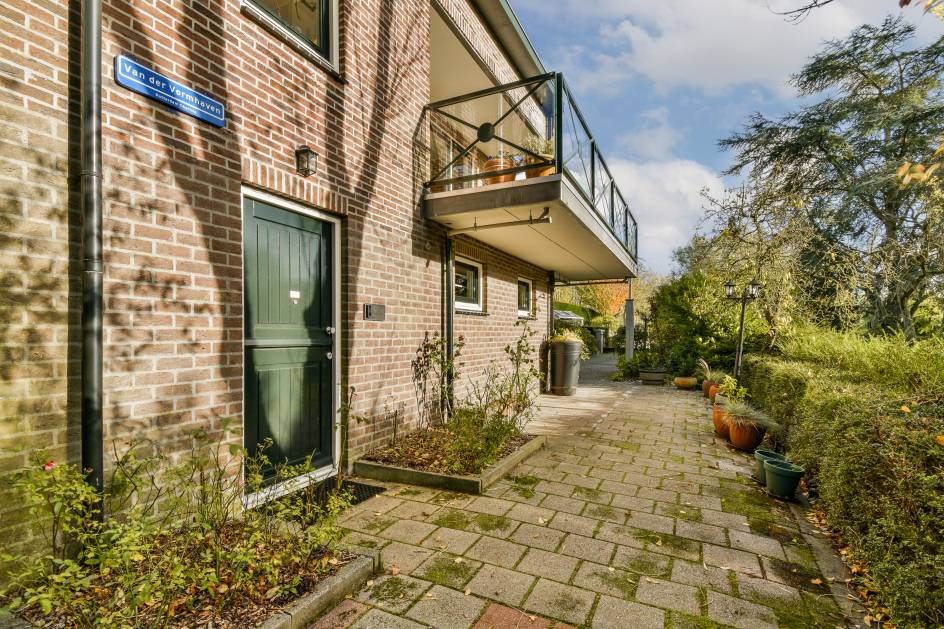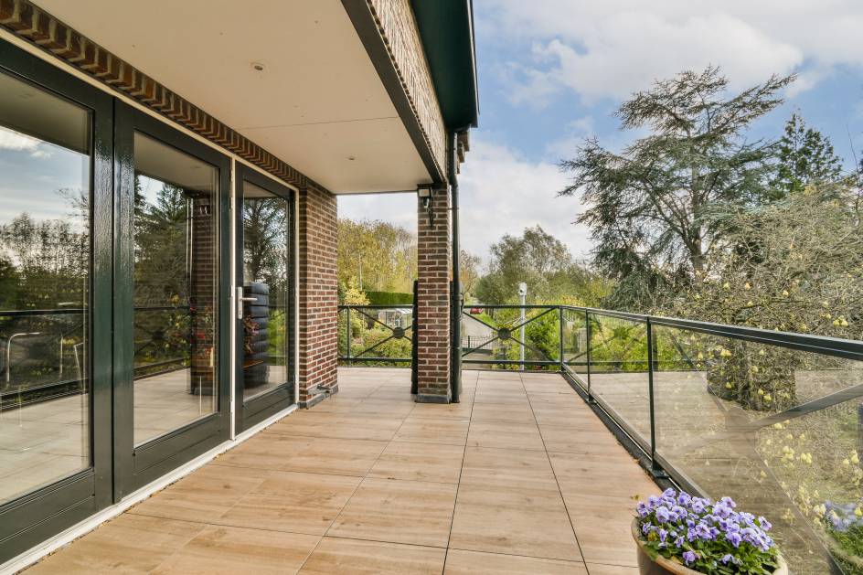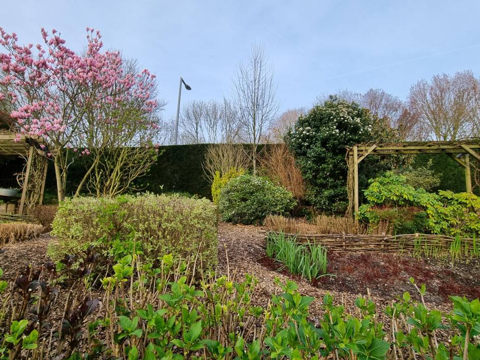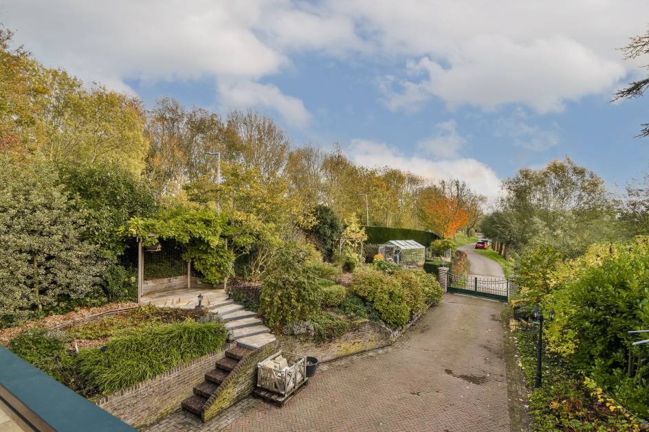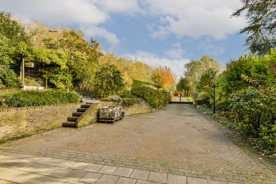 De tuin beschikt over een eigen oprit met elektrische poort, voetgangerspoortje en parkeergelegenheid op eigen terrein.