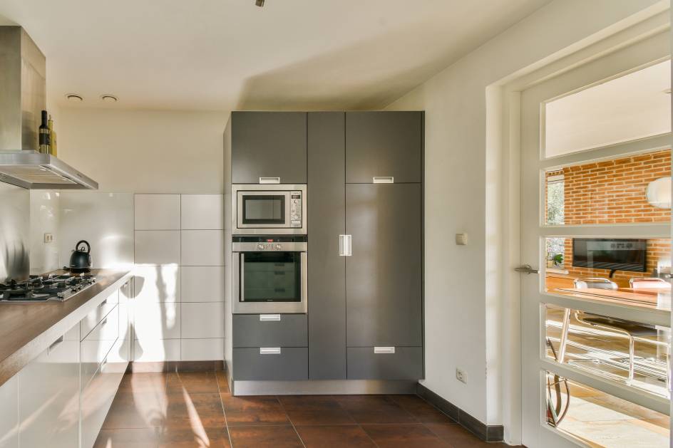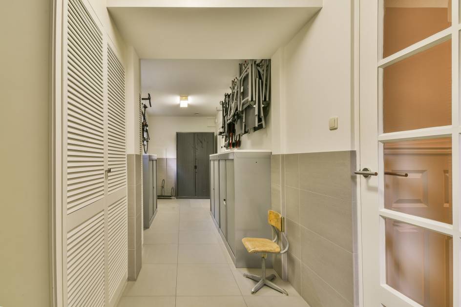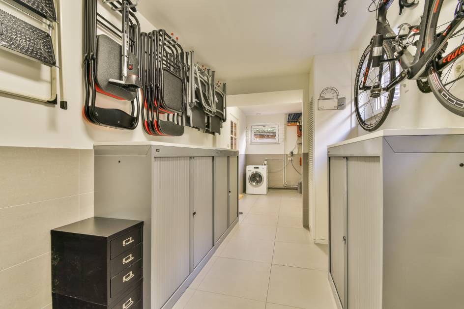 Via de tuin heeft u middels elektrische roldeuren toegang tot het souterrain met een dubbele garage, bijkeuken, hal met wasruimte en een tussenhal met trapopgang. Deze verdieping biedt volop praktische bergruimte en is ideaal voor hobby’s of het stallen van fietsen en gereedschap.