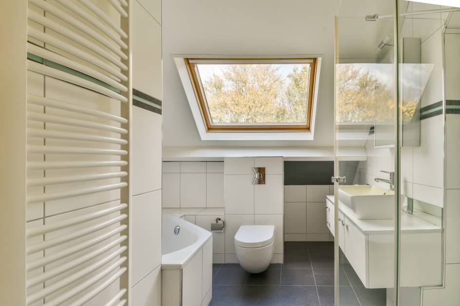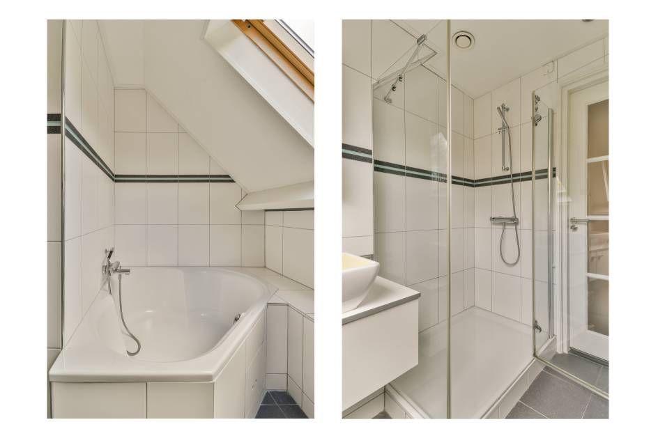 De moderne badkamer is netjes afgewerkt en beschikt over een hoekbad, inloopdouche, toilet, wastafel en vloerverwarming.