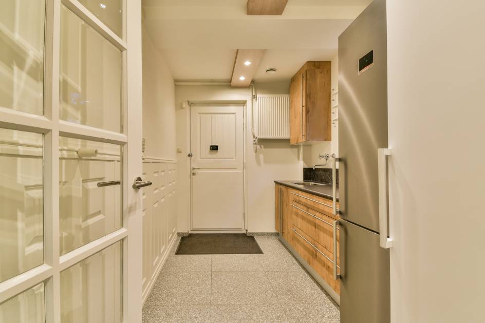 Vanuit de woonkamer is de keuken bereikbaar, uitgerust met diverse inbouwapparatuur en voldoende kastruimte. Verder bevindt zich op deze verdieping de entree vanaf de dijk met hal en toilet.