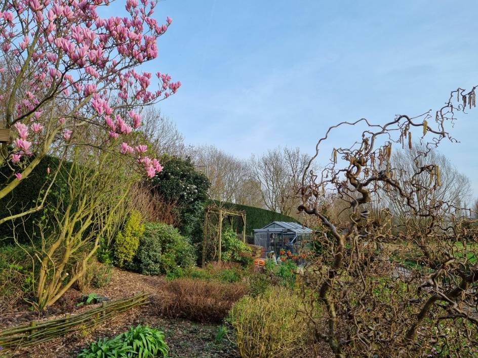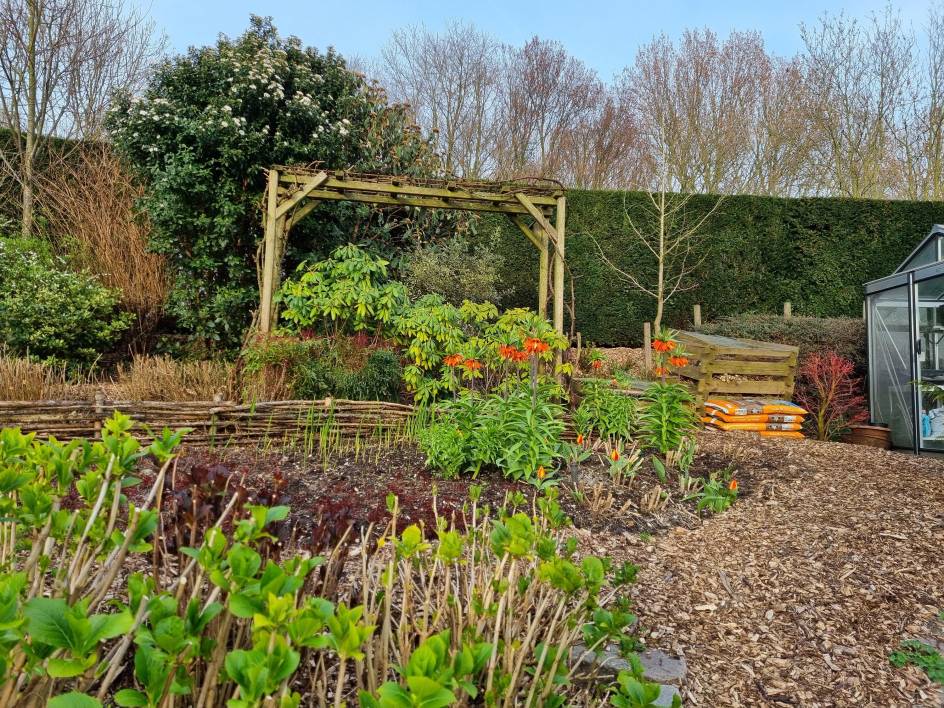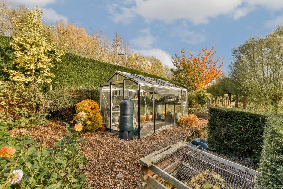 -Grote, fraai aangelegde tuin met oprit, kas en niveauverschil