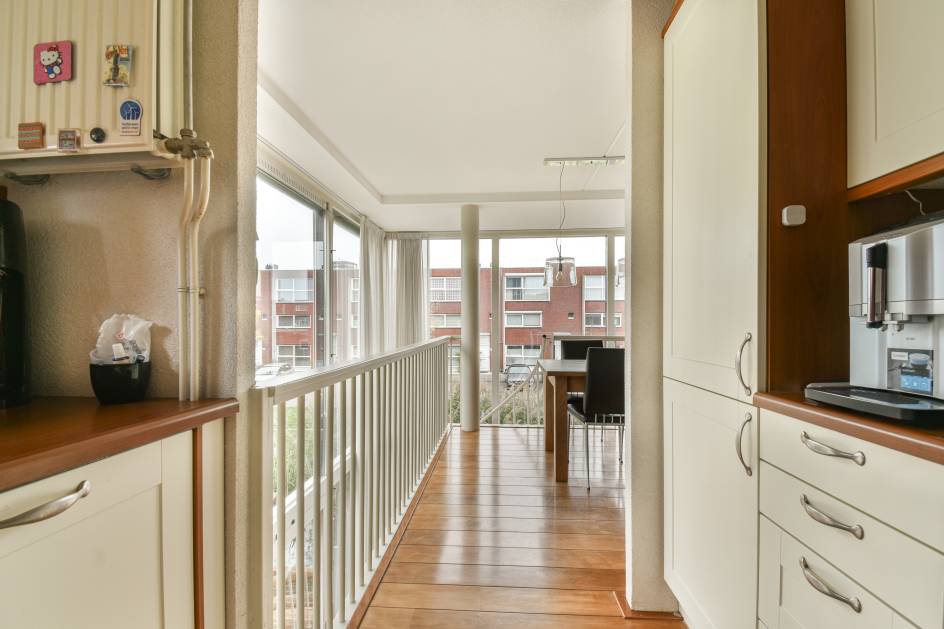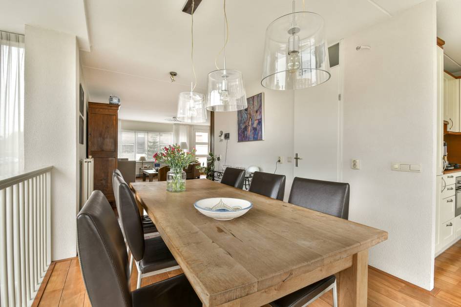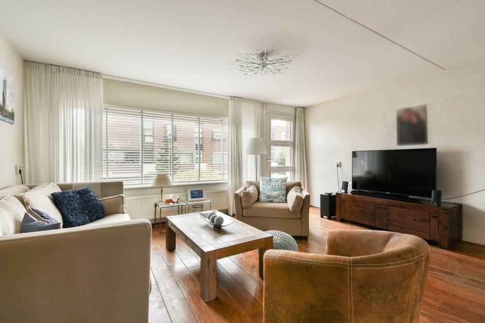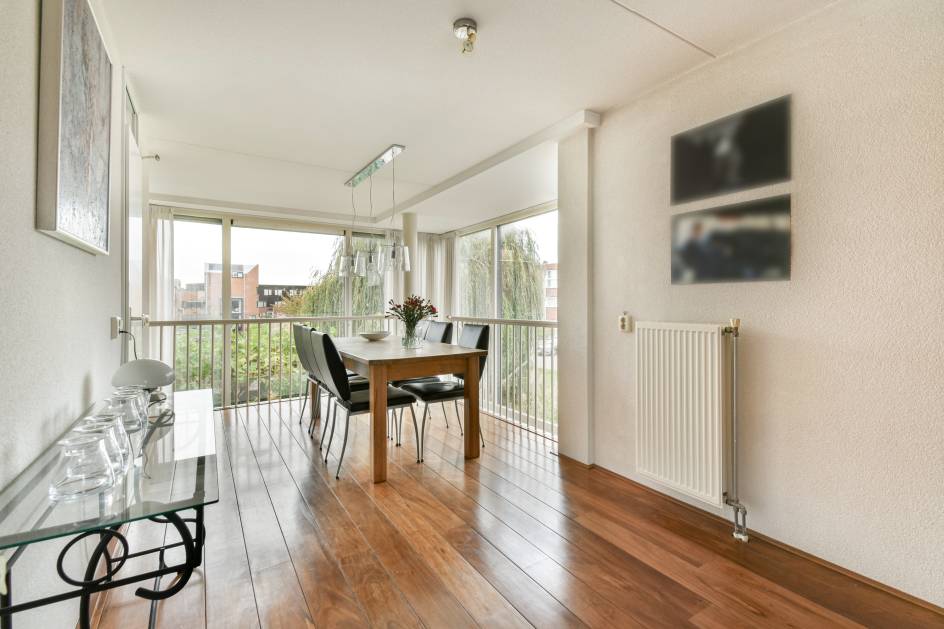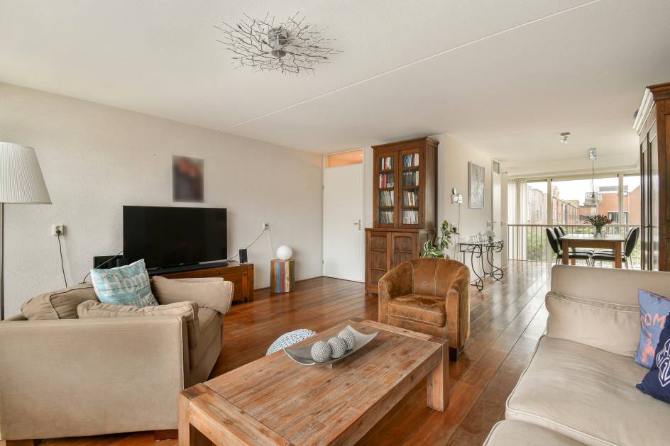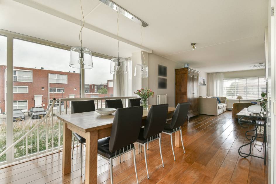 Op de eerste verdieping bevindt zich de lichte en sfeervolle woonkamer met hardhouten vloer, veel ramen en toegang tot het balkon aan de voorzijde (oosten) – perfect voor een kop koffie in de ochtendzon.