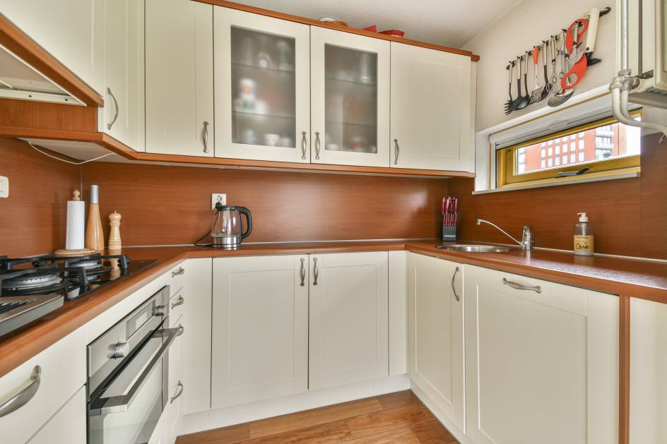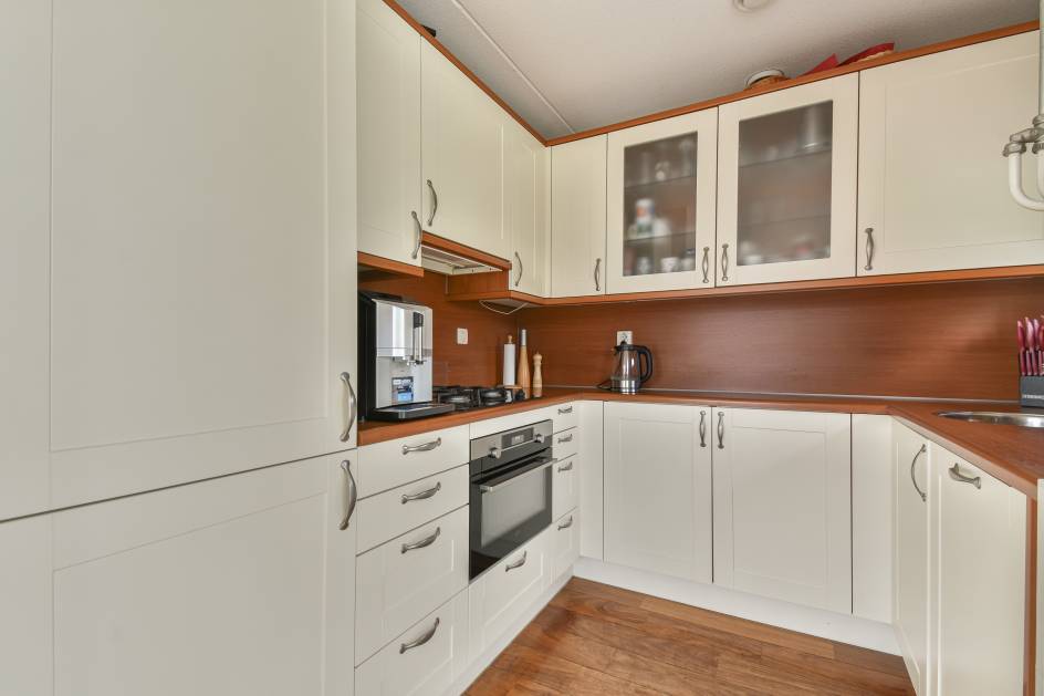 De open keuken is praktisch ingericht met een 4-pits gasfornuis, afzuigkap, combi-oven (AEG), vaatwasser en voldoende kastruimte.