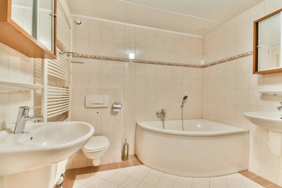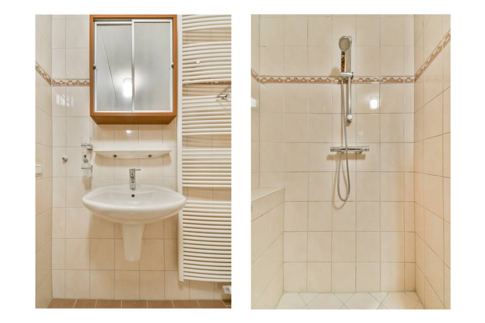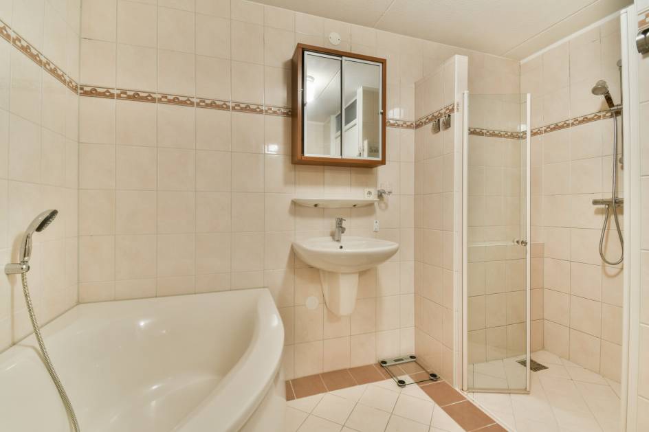 De bovenste verdieping biedt drie ruime slaapkamers, allemaal voorzien van op maat gemaakte horren. De moderne badkamer is royaal opgezet met een bad, ruime douchecabine en twee wastafels – ideaal voor het gezin.