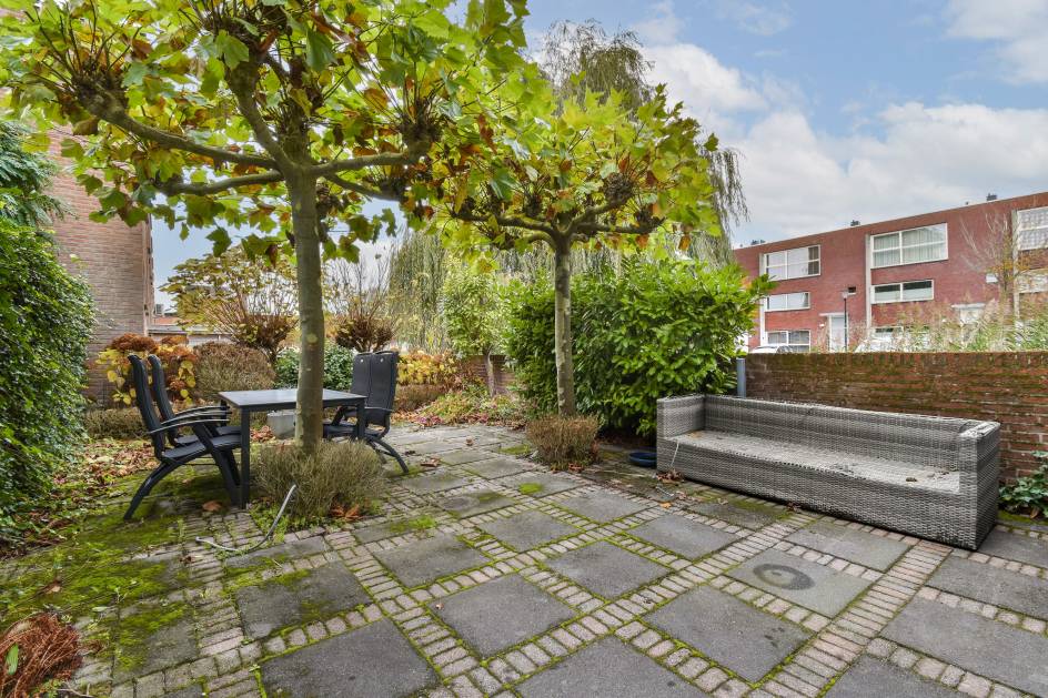 De zonnige achtertuin vormt een heerlijke plek om te genieten van de middag- en avondzon en is voorzien van bestrating en groenborders.