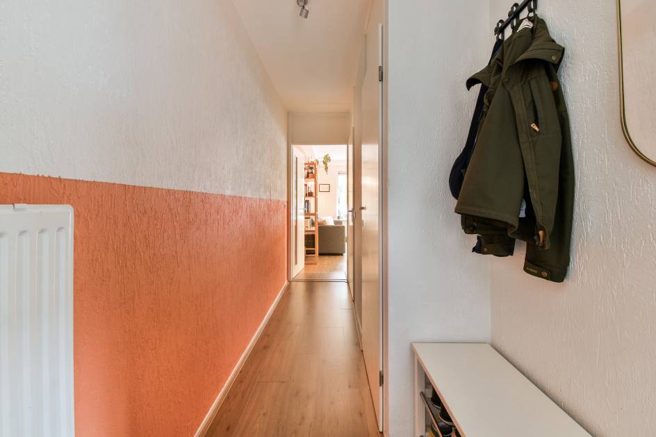 Entree en hal: Via de gezamenlijke entree bereikt u het appartement. De hal biedt toegang tot alle vertrekken en beschikt over de meterkast, voorzien van twee aardlekschakelaars en zes groepen.