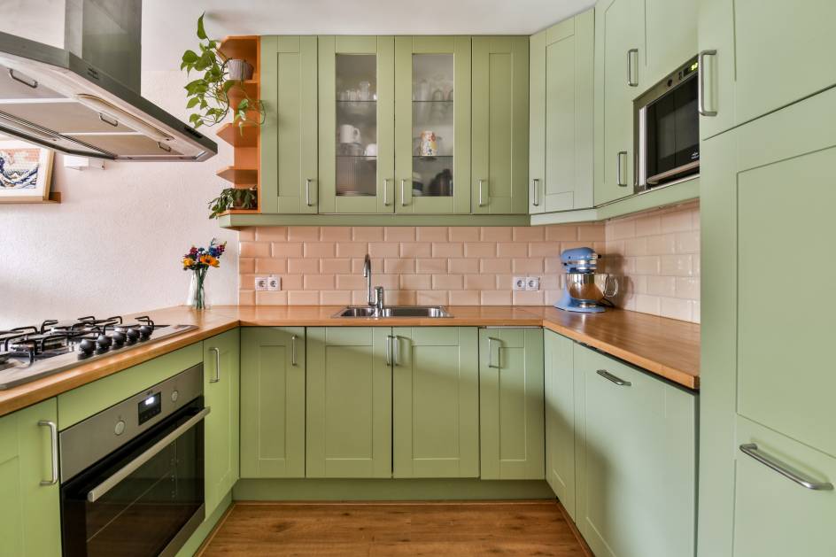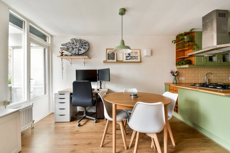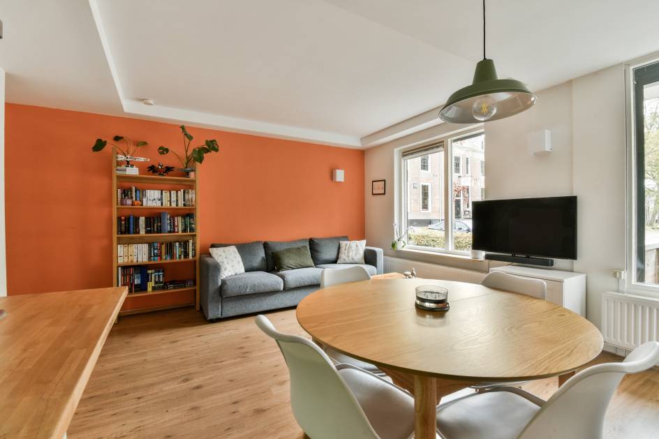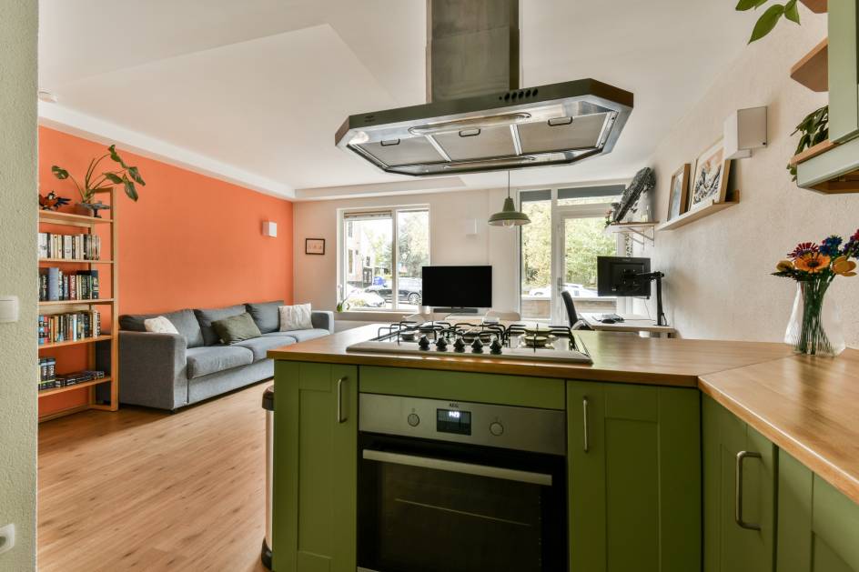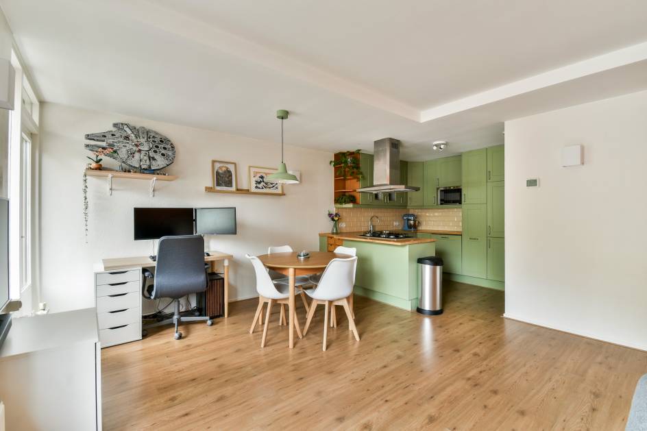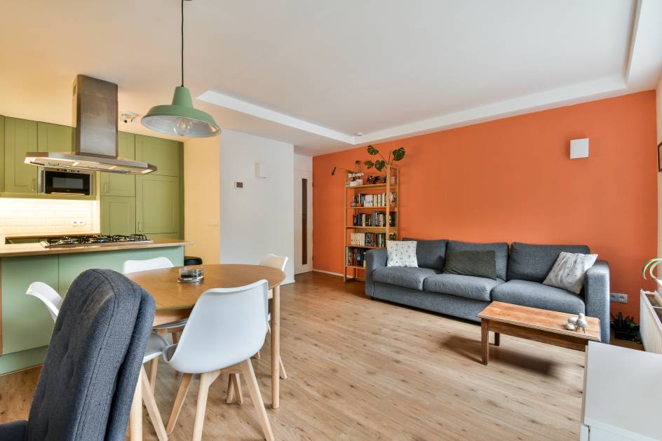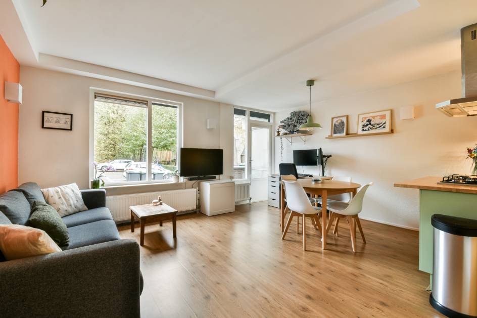 Woonkamer en keuken: De lichte woonkamer vormt het hart van de woning en biedt toegang tot het balkon. De open keuken is voorzien van diverse inbouwapparatuur, waaronder een 5-pits gaskookplaat, afzuigkap, vaatwasser, koel-/vriescombinatie, oven (2024) en magnetron. Onder de gootsteen bevindt zich een close-in boiler (2024) voor direct warm water.