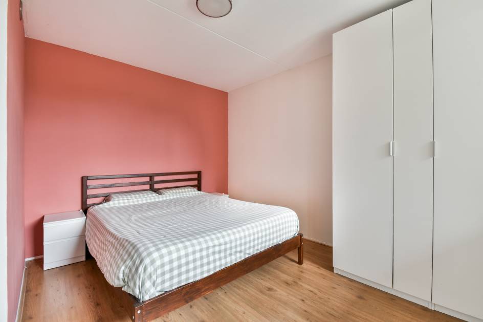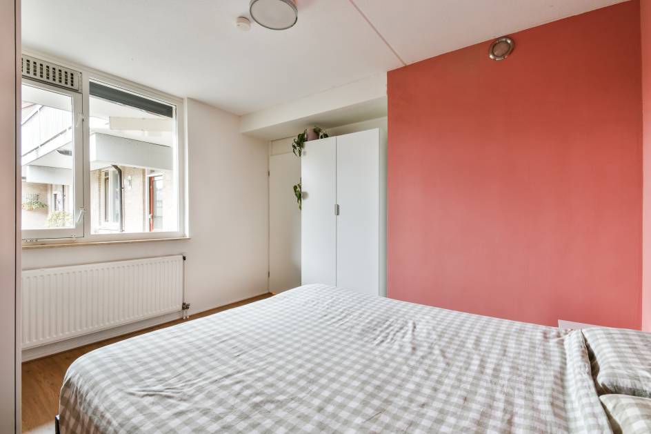 Slaapkamer: Aan de voorzijde van de woning bevindt zich een ruime slaapkamer met veel lichtinval. De kamer is voorzien van houten kozijnen met dubbele beglazing en een rolluik aan de buitenzijde.
