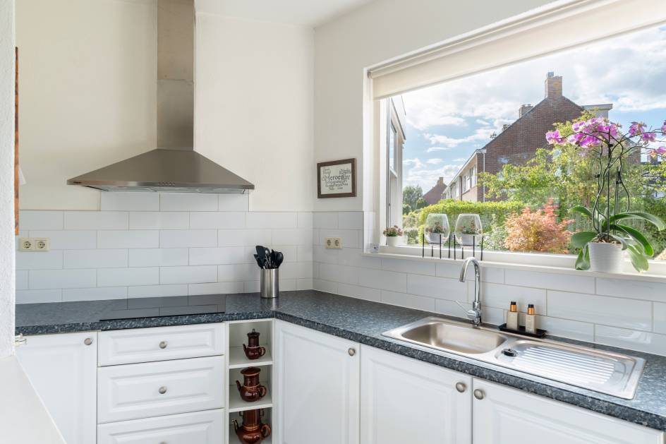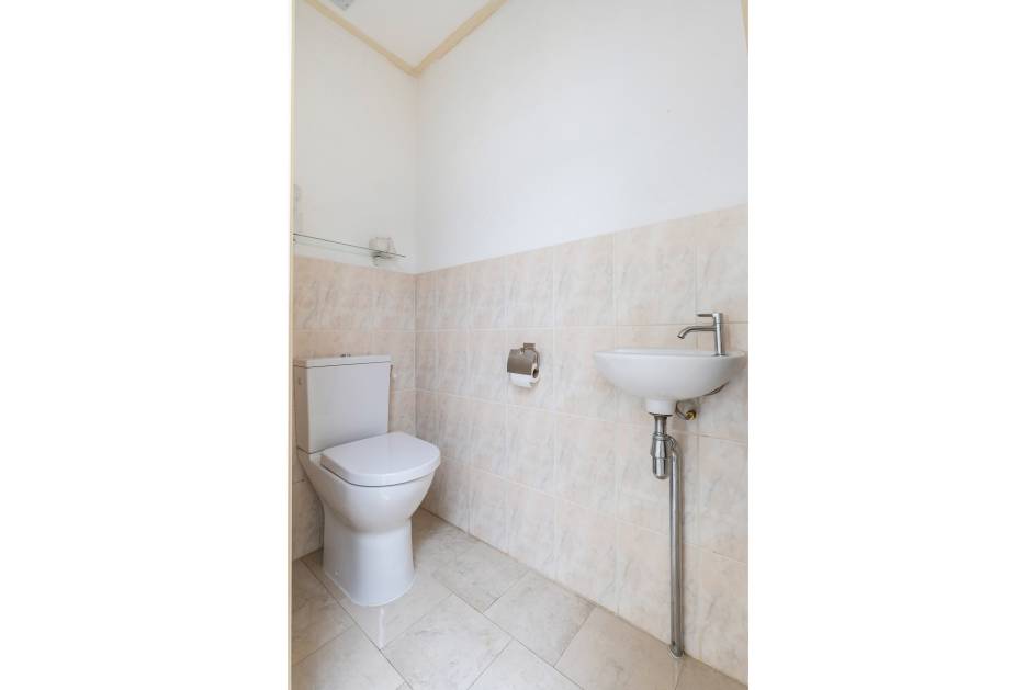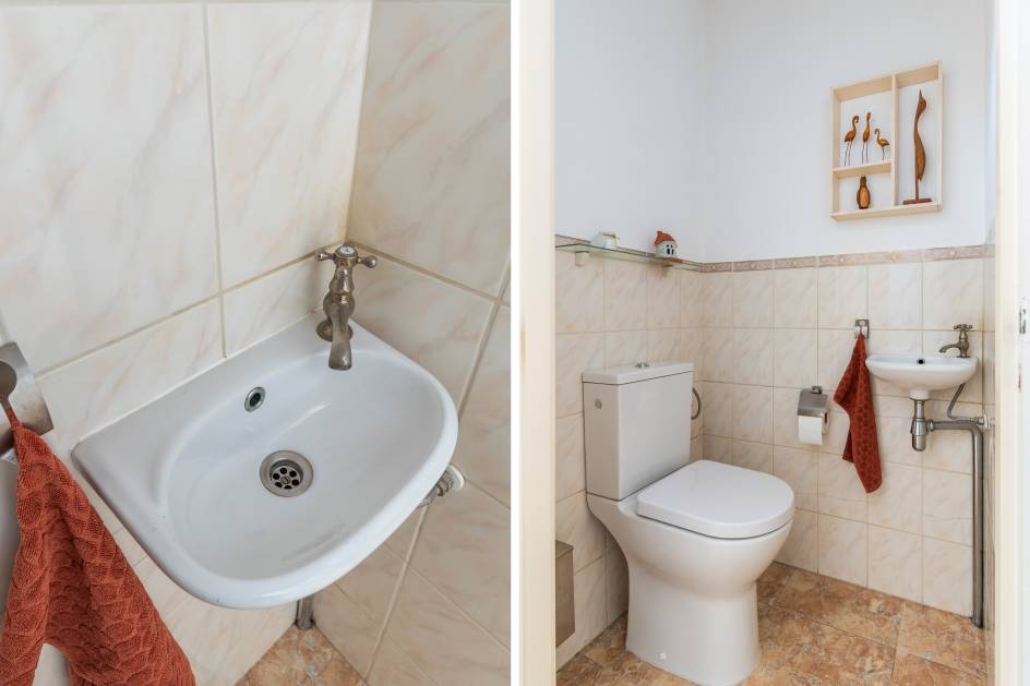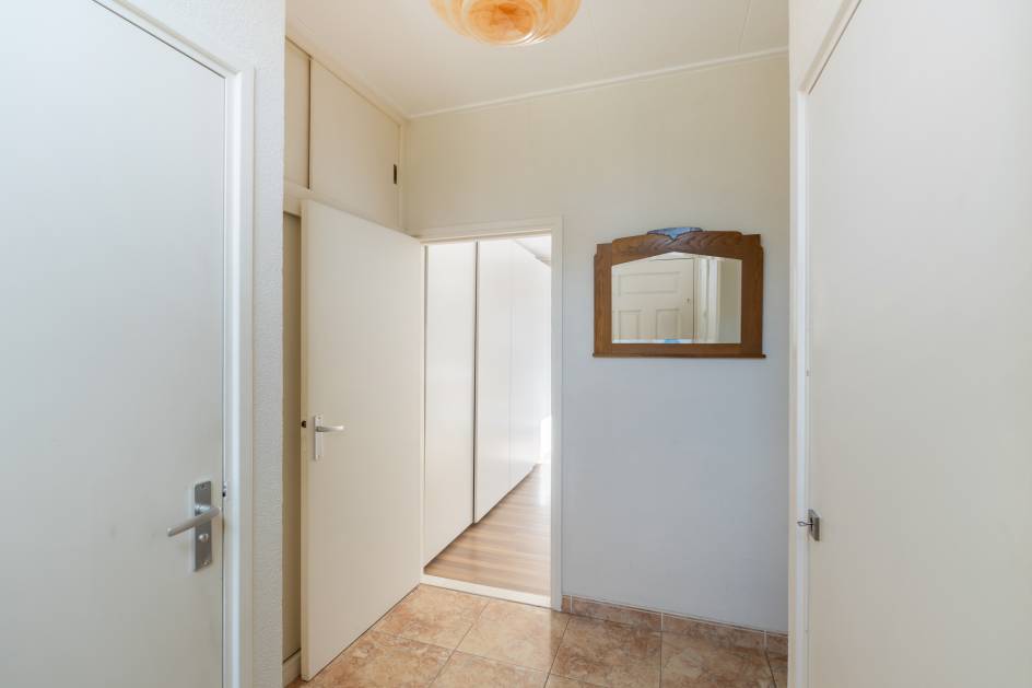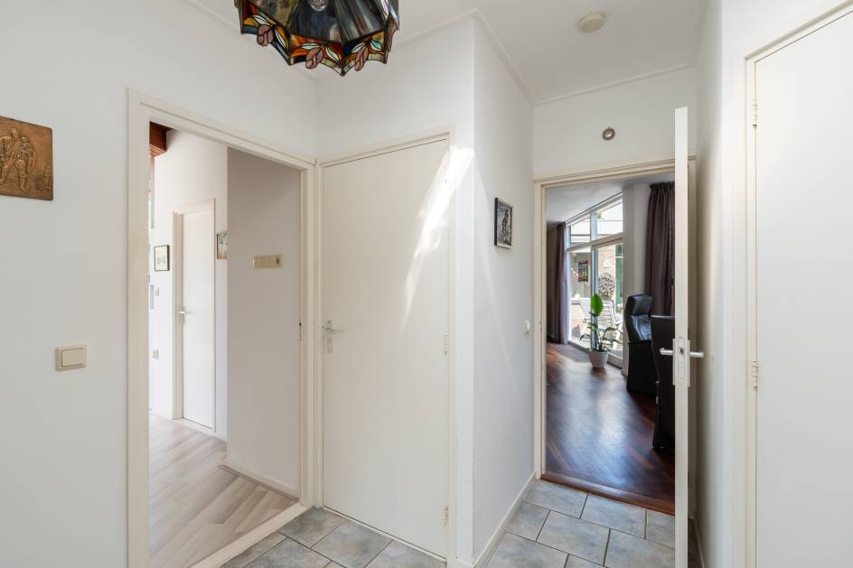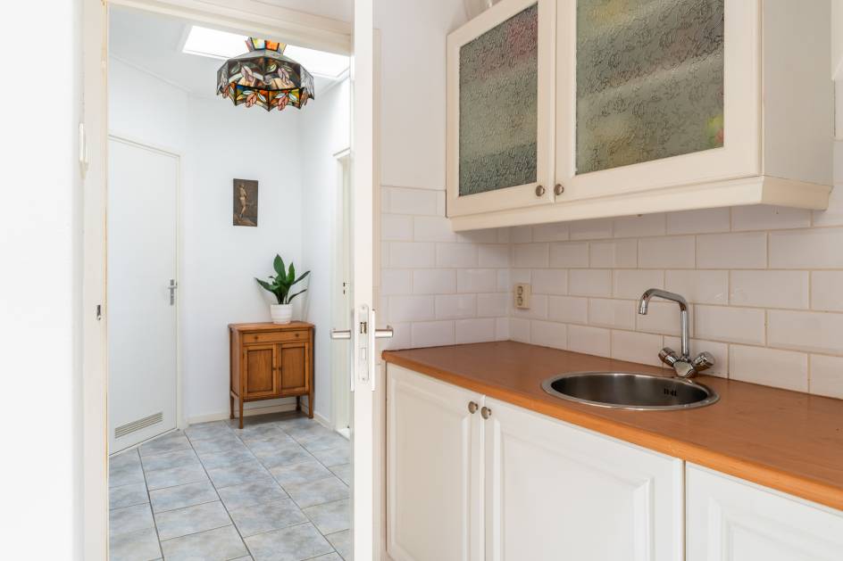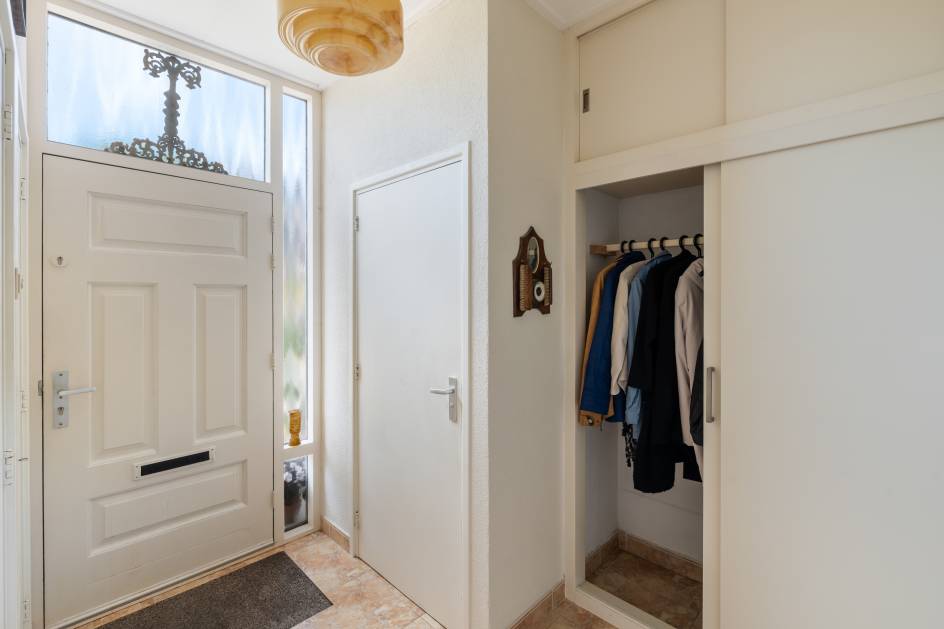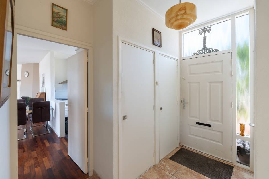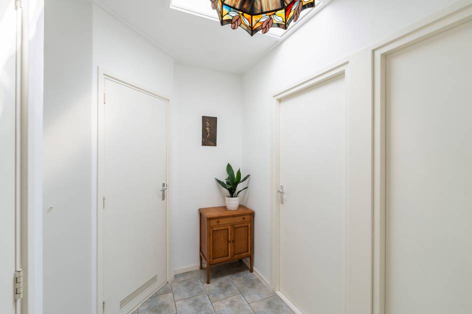 Via de ruime hal met meterkast, vaste kast, garderobekast en een keurig half betegeld toilet met fonteintje, kom je binnen in deze fijne woning.