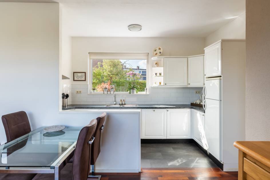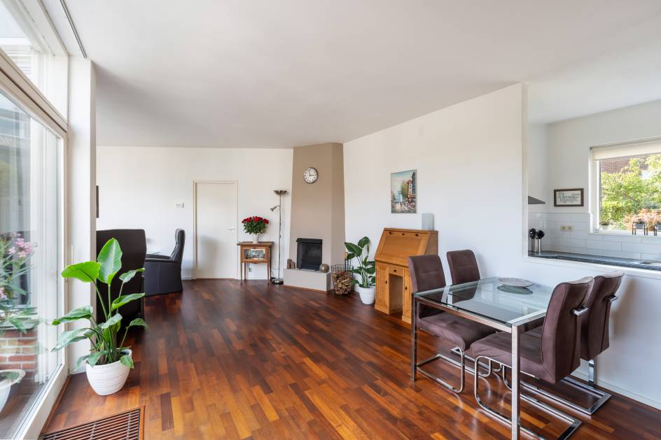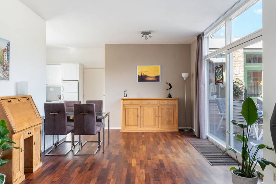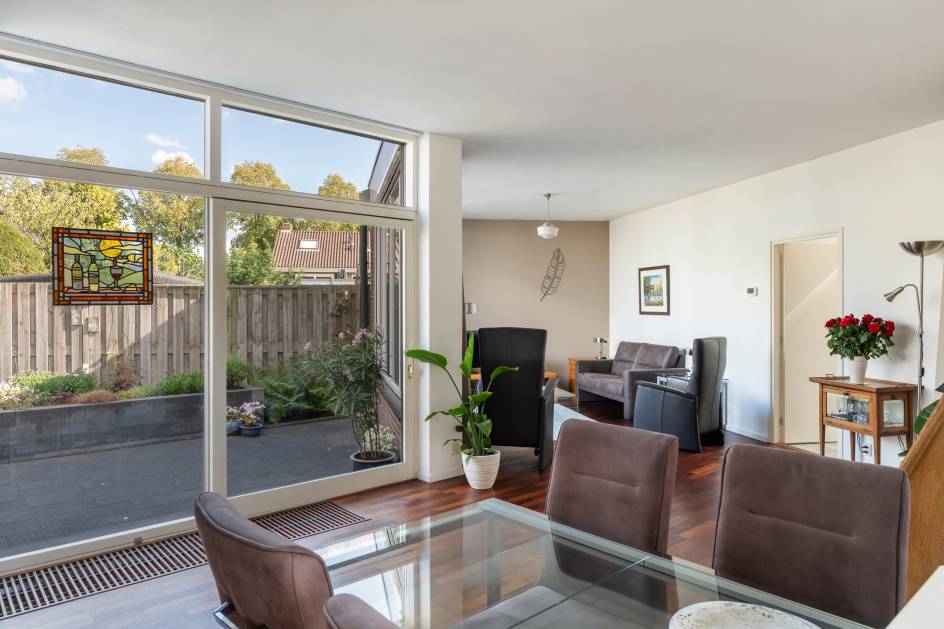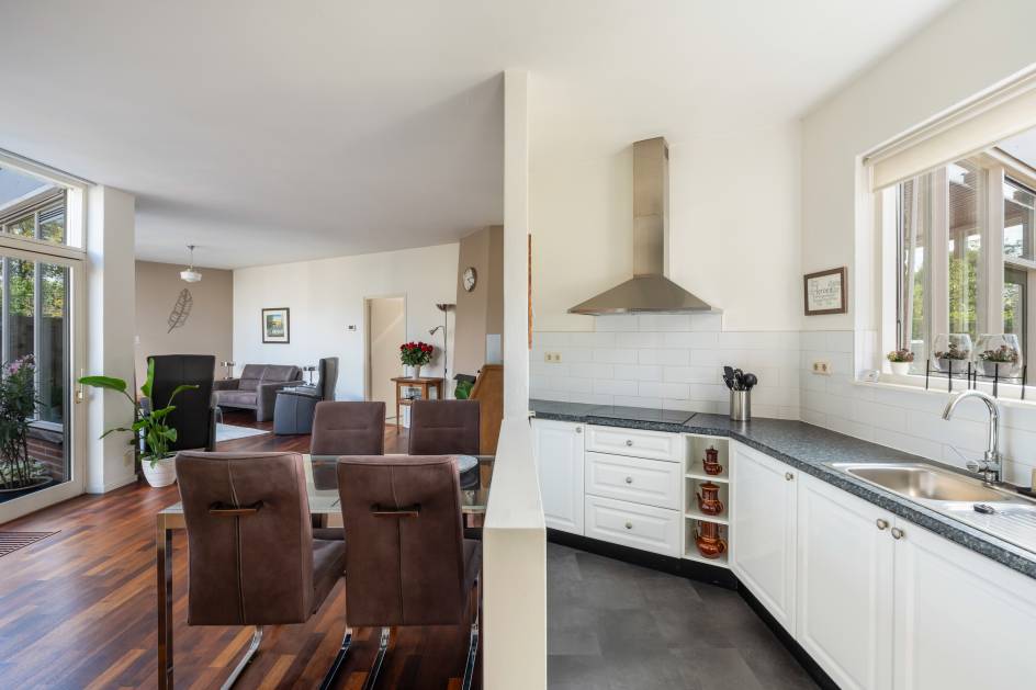 De royale woonruimte is direct opvallend door de fijne lichtinval en de speelse indeling. De open keuken staat in verbinding met de eetkamer, waar ruimte is voor een grote eettafel met uitzicht op de achtertuin.
