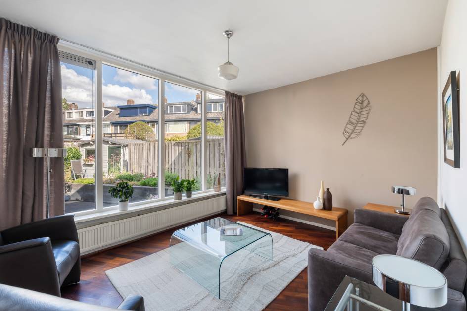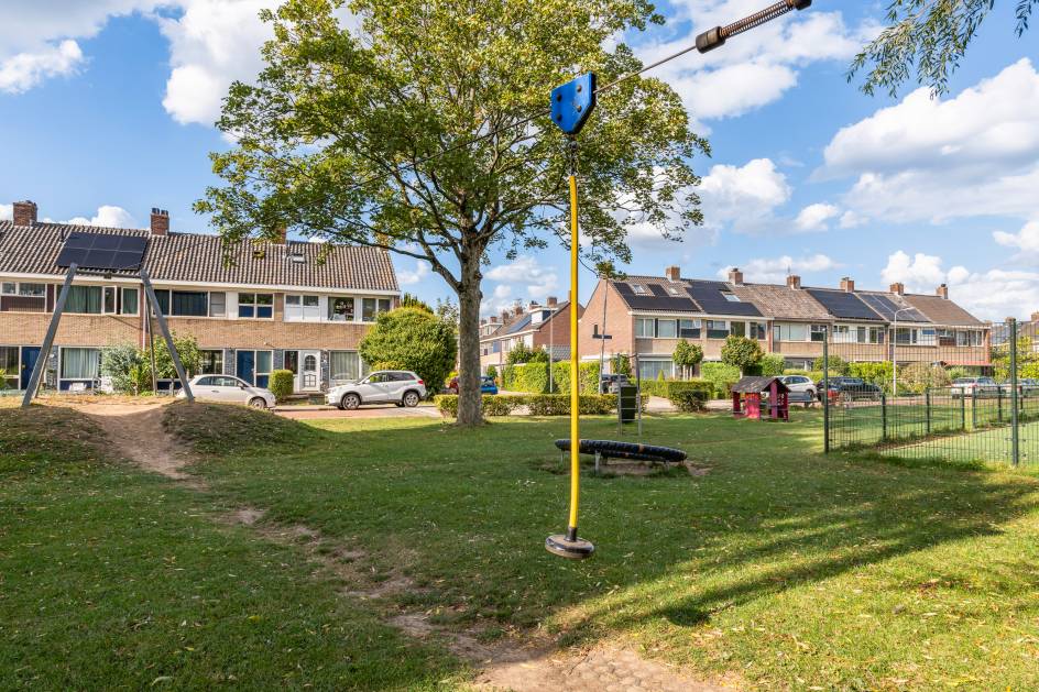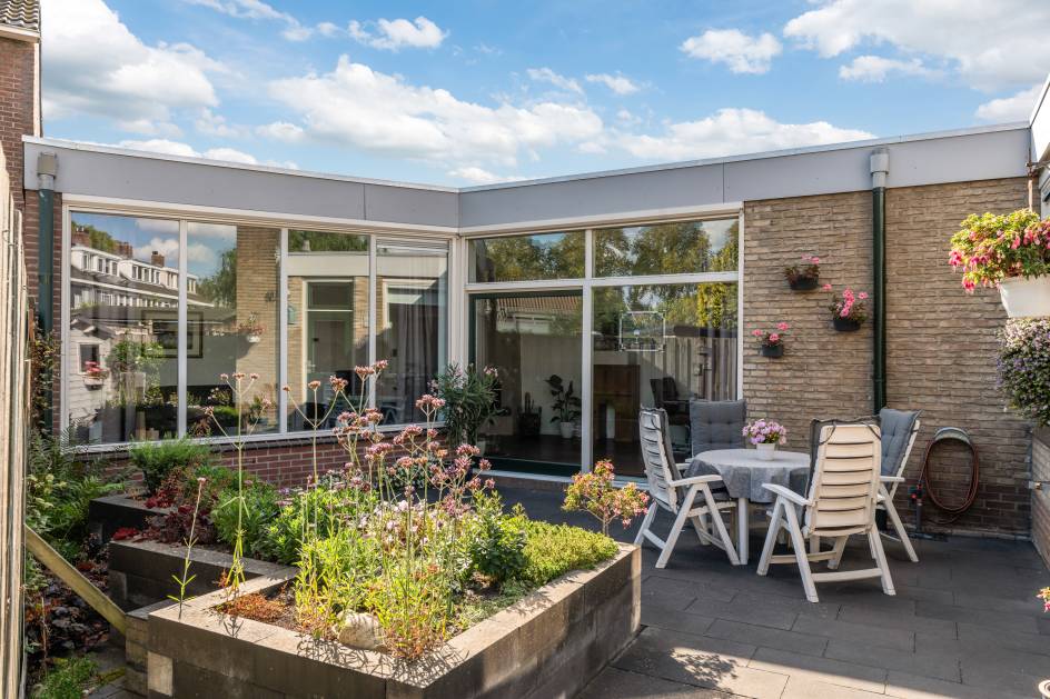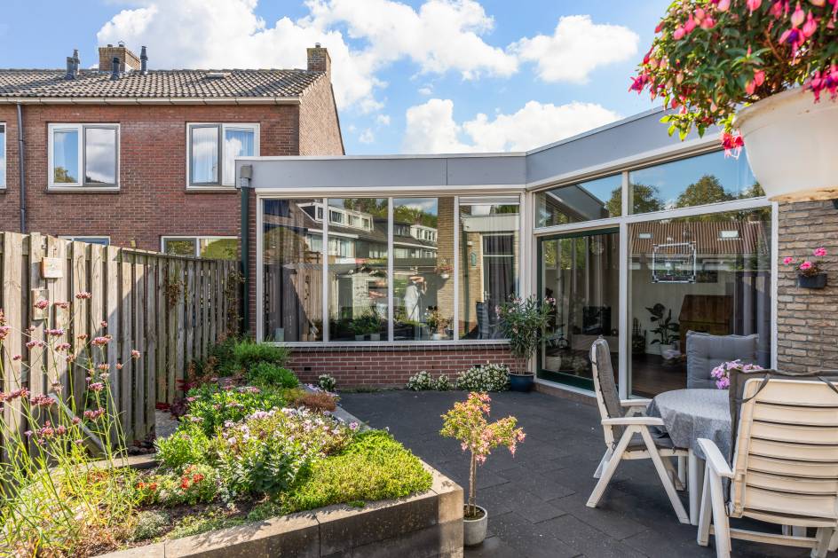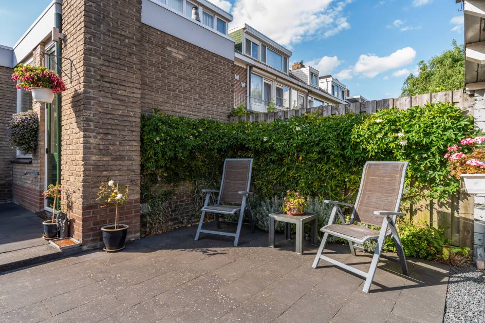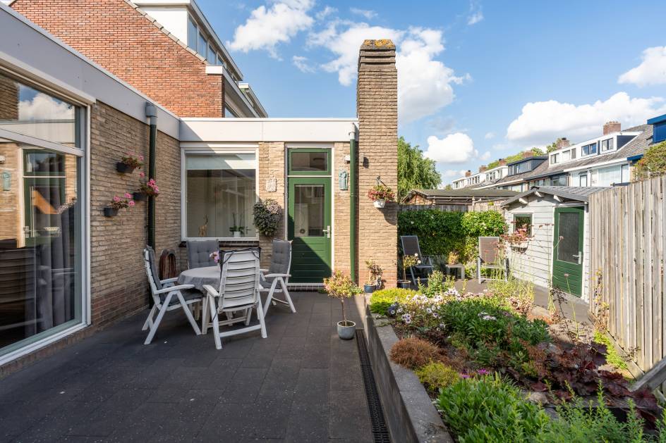 De woning beschikt over een ruime voor- en zijtuin op het noord- en zuidwesten en een zonnige achtertuin op het oosten. De achtertuin is voorzien van betegeling een sfeervolle plantenbak, groenborders en een houten berging – ideaal voor fietsen en tuinspullen.
