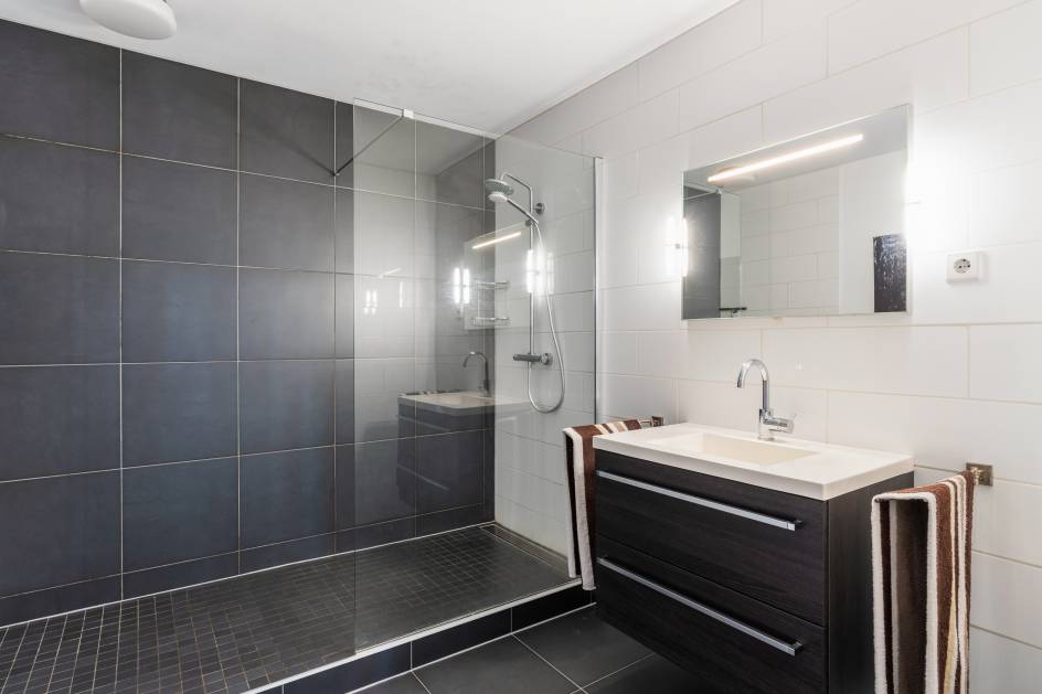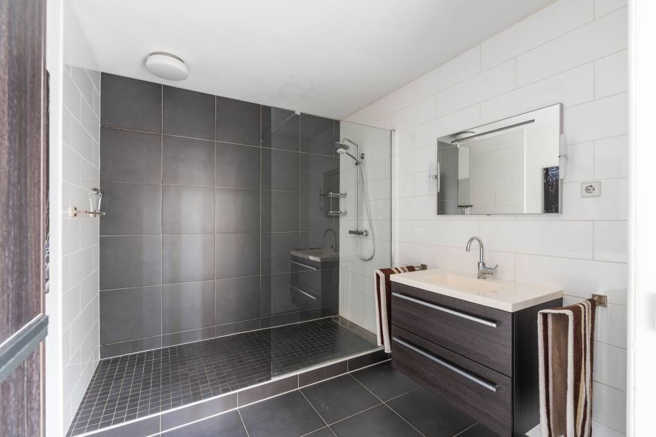 Deze zijn bereikbaar via een centrale hal ( met lichtkoepel) die ook toegang biedt aan het tweede toilet en de ruime, moderne badkamer (2010). De badkamer is voorzien van een inloopdouche met glazen wand, wastafelmeubel en wandkast. Er is vloerverwarming en voldoende ruimte voor het plaatsen van een ligbad.