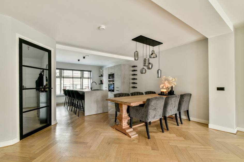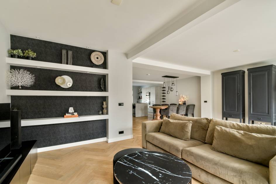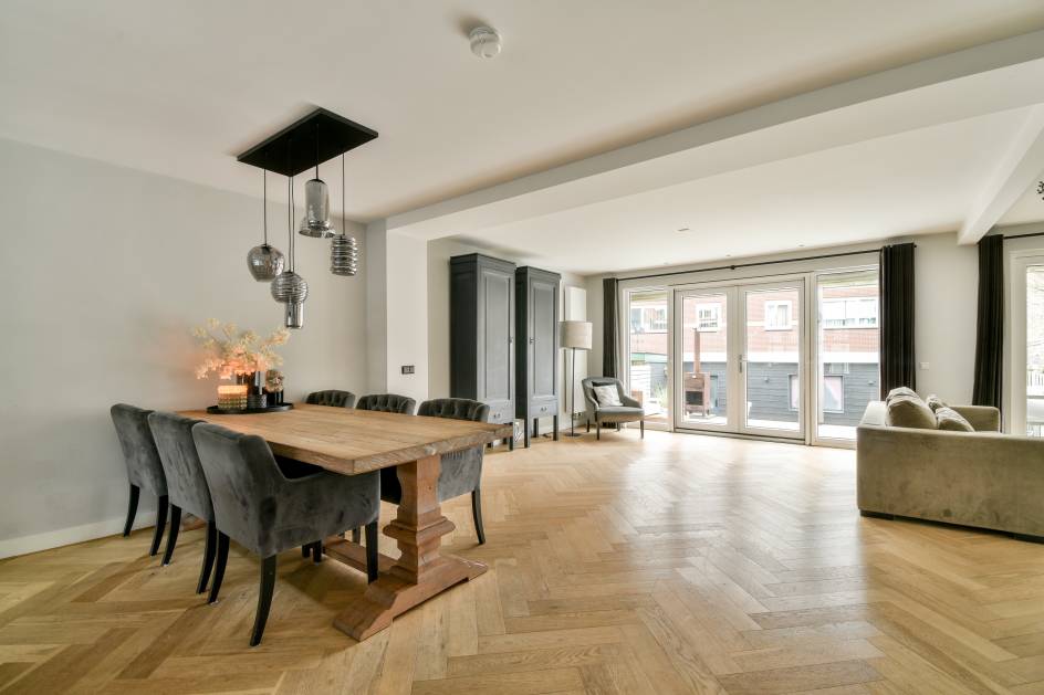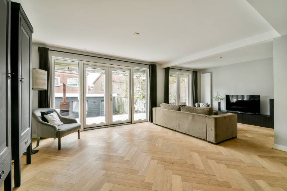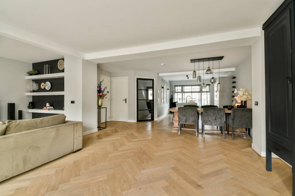 De ruime en lichte woonkamer biedt volop mogelijkheden voor een comfortabele zithoek en een grote eettafel. Dankzij de open indeling sluit de keuken naadloos aan op het leefgedeelte.